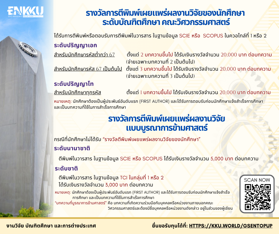 | บว.37 | ให้นักศึกษากรอกข้อมูลเผยแพร่ผลงานที่ http://gsmis.gs.kku.ac.th/ และ นักศึกษาแจ้งชื่อและรหัสนักศึกษาพร้อมกับแนบไฟล์ บว.37 ส่งเข้าเมล์ graduate@kku.ac.th (Students are required to fill in the publication information at http://gsmis.gs.kku.ac.th/ and send their name and student ID together with the attached Form BW.37 to graduate@kku.ac.th) |