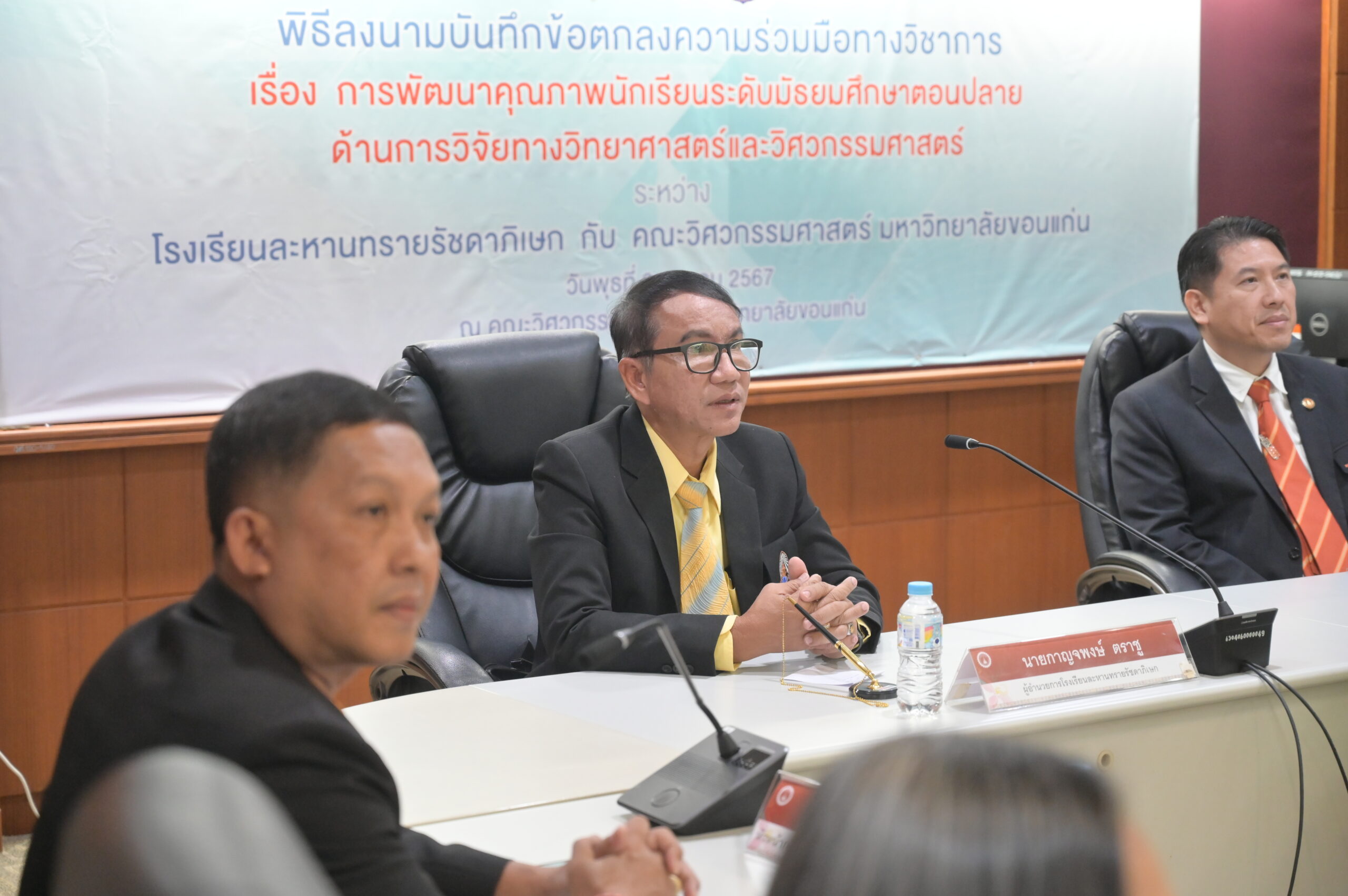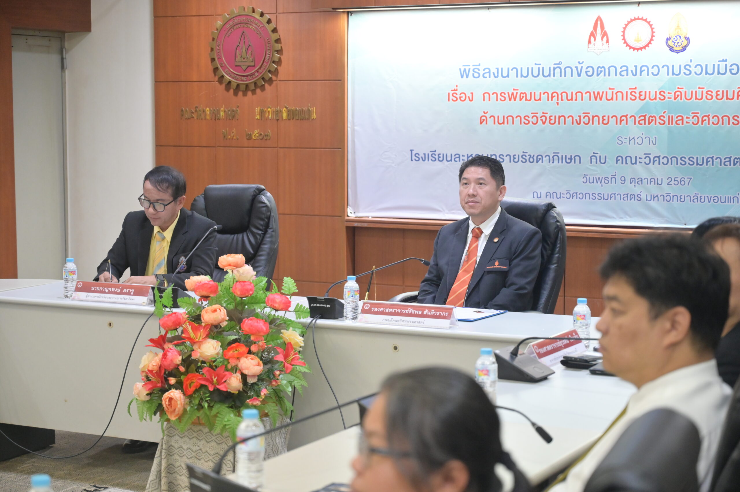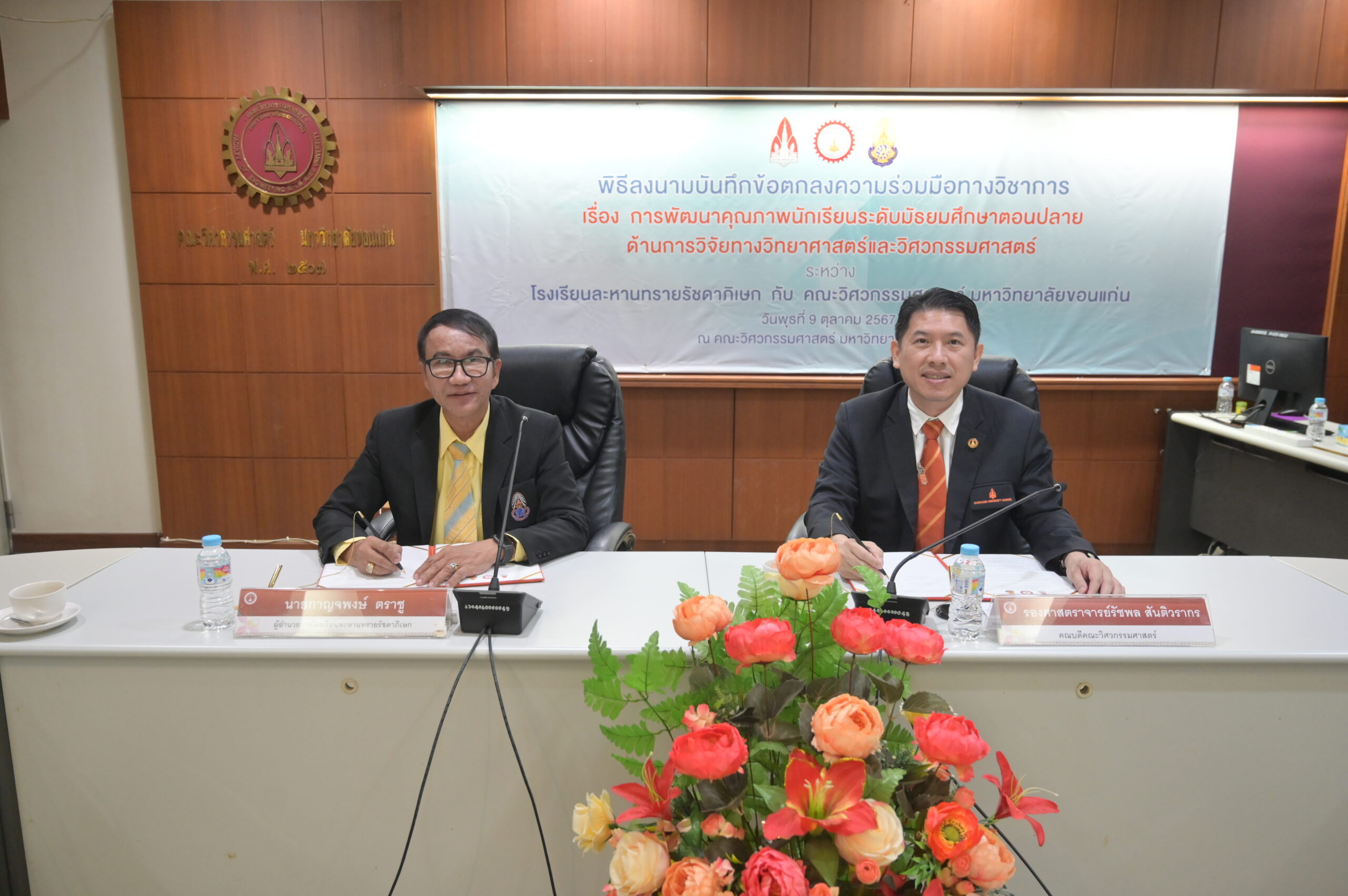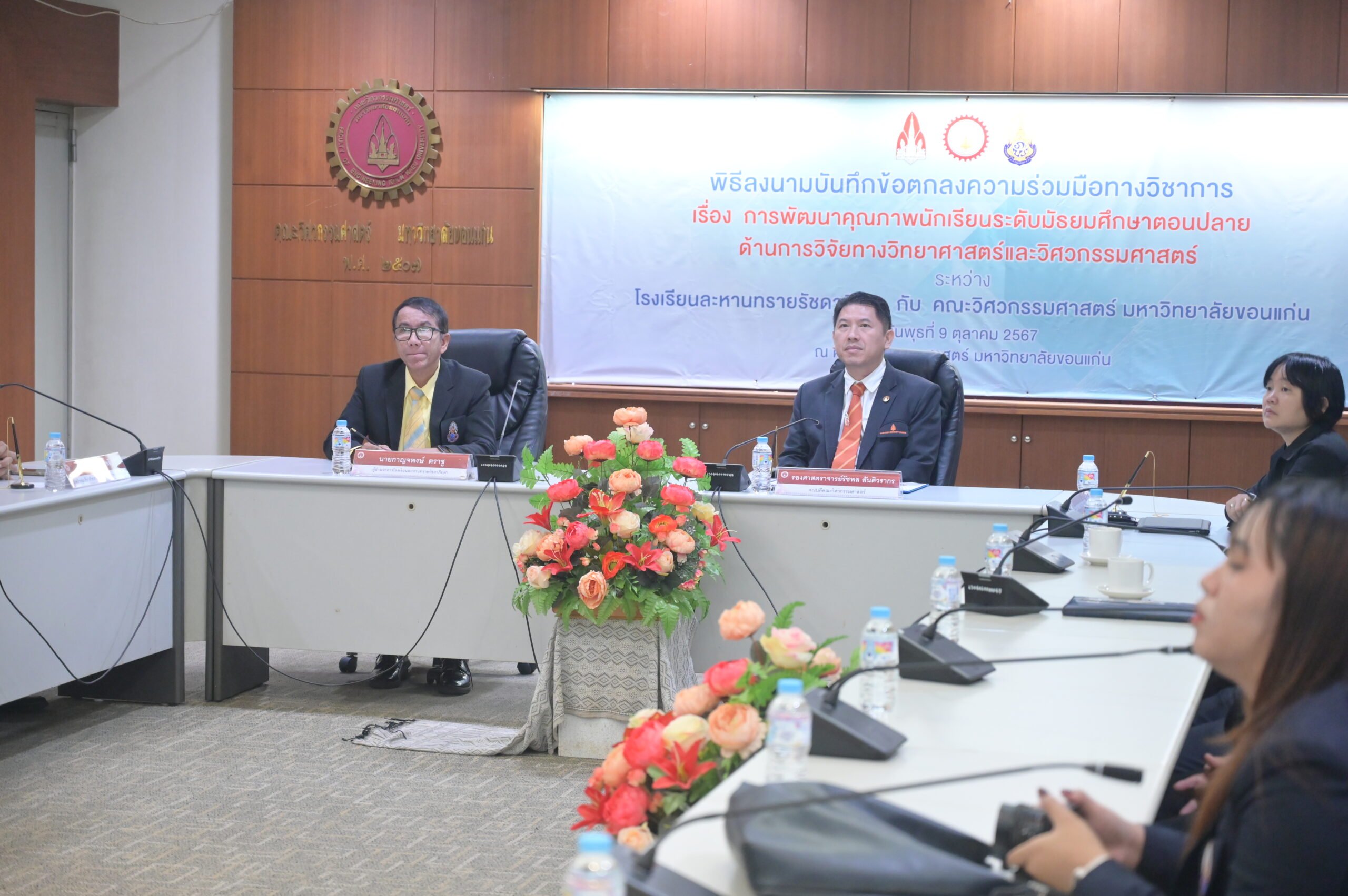 เมื่อวันพุธที่ 9 ตุลาคม 2567 คณะวิศวกรรมศาสตร์ มหาวิทยาลัยขอนแก่น ร่วมกับ โรงเรียนละหานทรายรัชดาภิเษก ได้จัดให้มีพิธีลงนามบันทึกข้อตกลงความร่วมมือทางวิชาการ เรื่อง การพัฒนาคุณภาพนักเรียนระดับมัธยมศึกษาตอนปลาย ด้านการวิจัยทางวิทยาศาสตร์และวิศวกรรมศาสตร์ ณ ห้องประชุม 1 ชั้น 8 ตึกเพียรวิจิตร คณะวิศวกรรมศาสตร์ โดยมี รองศาสตราจารย์รัชพล สันติวรากร คณบดีคณะวิศวกรรมศาสตร์ และคณาจารย์ของคณะฯ ร่วมให้การต้อนรับ อาจารย์กาญจนพงษ์ ตราชู ผู้อำนวยการโรงเรียนละหานทรายรัชดาภิเษก และคณาจารย์จากโรงเรียน พร้อมทั้งแขกผู้มีเกียรติที่มาร่วมงาน