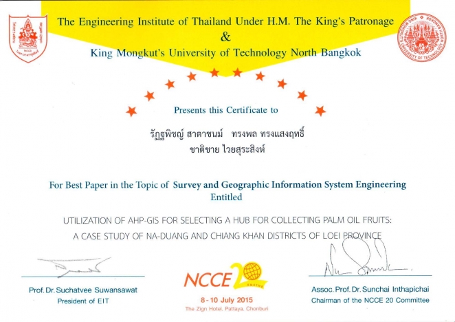 ผลงานนายรัฏพิชญ์ สาตาชนม์ นักศึกษาปริญญาโท สาขาวิศวกรรมสำรวจ ภาควิชาวิศวกรรมโยธา ได้รับรางวัล Best Paper in the Topic of Survey and Geographic Information System Engineering ในการประชุมวิชาการวิศวกรรมโยธาแห่งชาติ ครั้งที่ 20 หัวข้อ ” วิศวกรรมโยธากับการก้าวเข้าสู่ประชาคมเศรษฐกิจอาเซียน” ณ โรงแรมเดอะซายน์ พัทยาเหนือ จ.ชลบุรี เมื่อวันที่ 8 – 10 กรกฎาคม 2558 จัดโดยมหาวิทยาลัยเทคโนโลยีพระจอมเกล้าพระนครเหนือเป็นเจ้าภาพ โดยนายรัฏพิชญ์ สาตาชนม์ ได้บรรยายในหัวข้อ ” การใช้ AHP-GIS ในการคัดเลือกจุดรับซื้อผลปาล์มน้ำมัน : กรณีศึกษา นาด้วง และเชียงคาน จังหวัดเลย ” ซึ่งมี ผศ.ดร.ชาติชาย ไวยสุระสิงห์ เป็นที่ปรึกษาและเป็นผู้รับผิดชอบบทความ