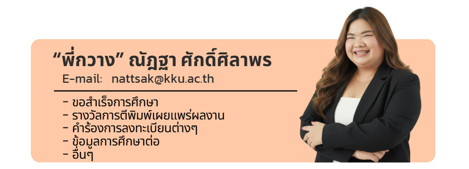 | บว.37 | ให้นักศึกษากรอกข้อมูลเผยแพร่ผลงานที่ http://gsmis.gs.kku.ac.th/ และ นักศึกษาแจ้งชื่อและรหัสนักศึกษาพร้อมกับแนบไฟล์ บว.37 ส่งเข้าเมล์ graduate@kku.ac.th (Students are required to fill in the publication information at http://gsmis.gs.kku.ac.th/ and send their name and student ID together with the attached Form BW.37 to graduate@kku.ac.th) |
