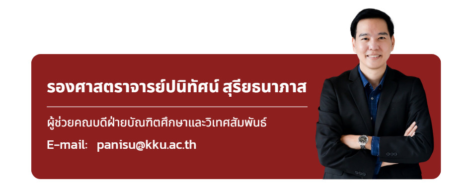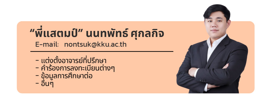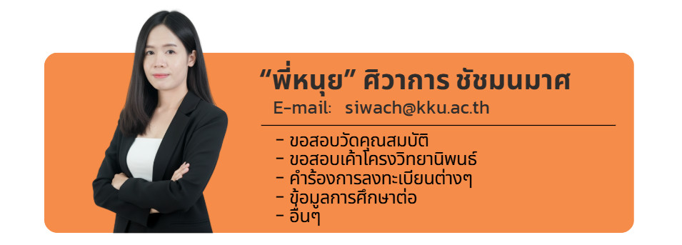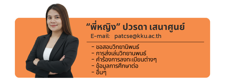 | e-thesis | ให้นักศึกษาส่งเล่มฉบับสมบูรณ์ที่ (Students are required to submit the final bound thesis) https://app.gs.kku.ac.th/gs/th/page/e-thesis/e-Thesis |