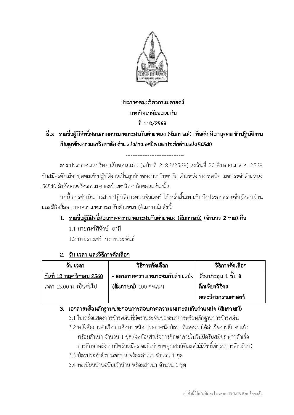 ประกาศรายชื่อผู้สอบสัมภาษณ์ ตำแหน่งช่างเทคนิค เลขประจำตำแหน่ง 54540