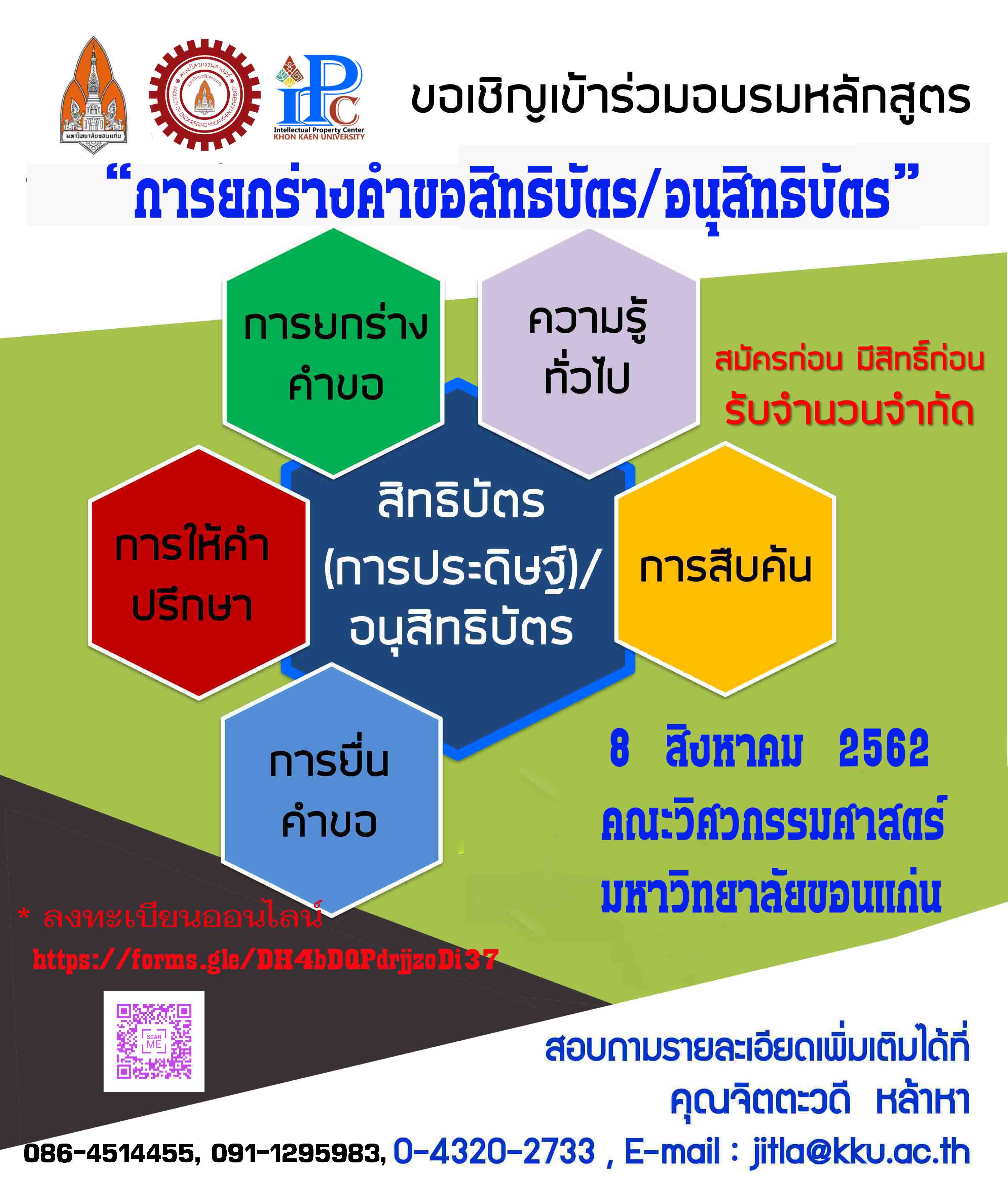 ผู้สนใจลงทะเบียนได้ที่  https://ip.kku.ac.th/register8.html