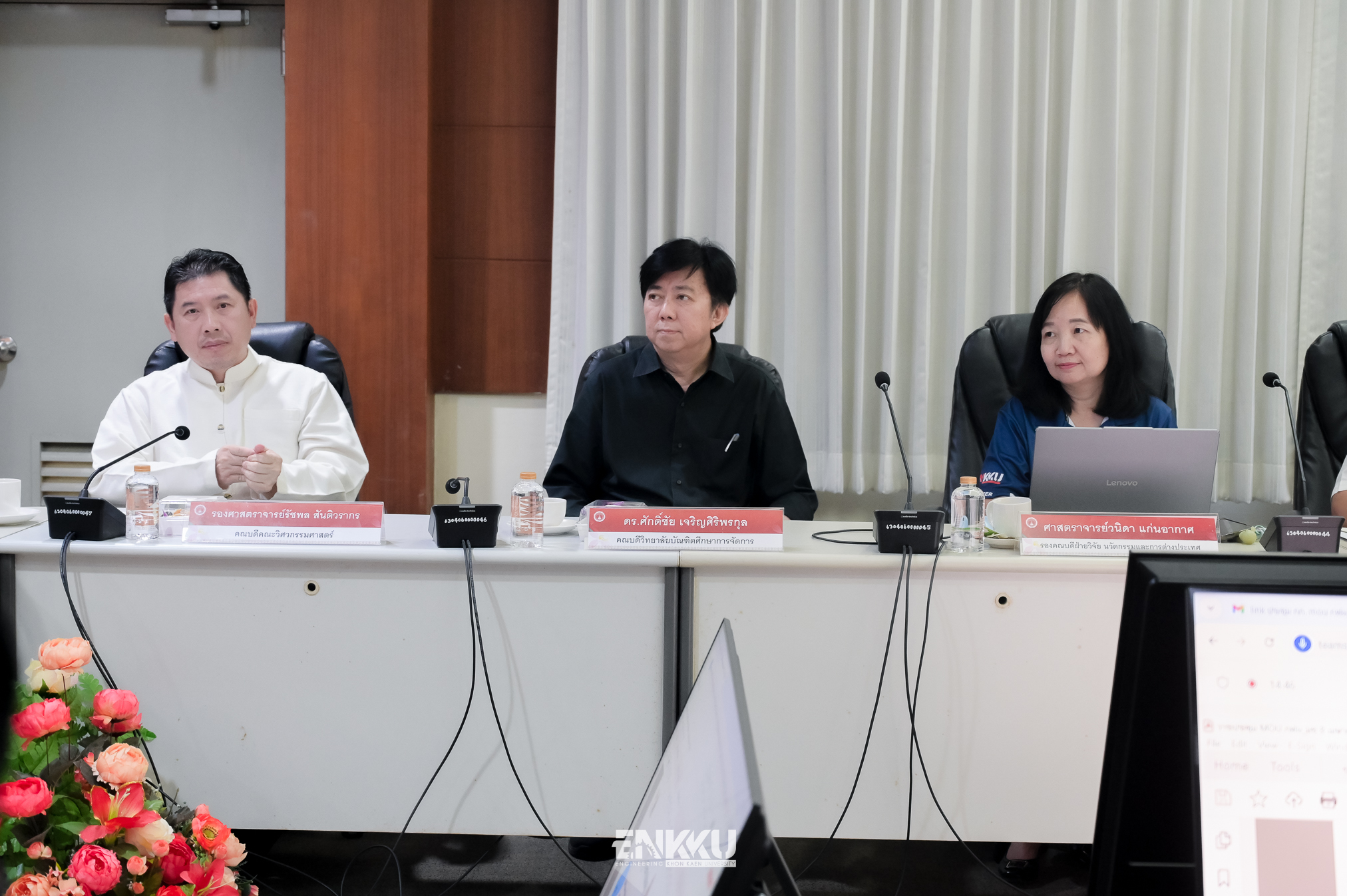 ในการนี้ ฝ่ายมหาวิทยาลัยขอนแก่น นำโดย ศาสตราจารย์ธิดารัตน์ บุญมาศ รองอธิการบดีฝ่ายวิสาหกิจและสังคมยั่งยืน รองศาสตราจารย์รัชพล สันติวรากร คณบดีคณะวิศวกรรมศาสตร์ และ ดร.ศักดิ์ชัย เจริญศิริพรกุล คณบดีวิทยาลัยบัณฑิตศึกษาการจัดการ เข้าร่วมประชุมร่วมกับคณะผู้บริหารจากการไฟฟ้าฝ่ายผลิตแห่งประเทศไทย นำโดย นายสหชาติ พิลาออน ผู้อำนวยการฝ่ายปฏิบัติการภาคตะวันออกเฉียงเหนือ แทน รองผู้ว่าการปฏิบัติการระบบส่ง (รวส.) นายสุนทร ดาวประเสริฐ ผู้อำนวยการโรงไฟฟ้าน้ำพอง พร้อมด้วยคณะกรรมการจากทั้งสองหน่วยงาน