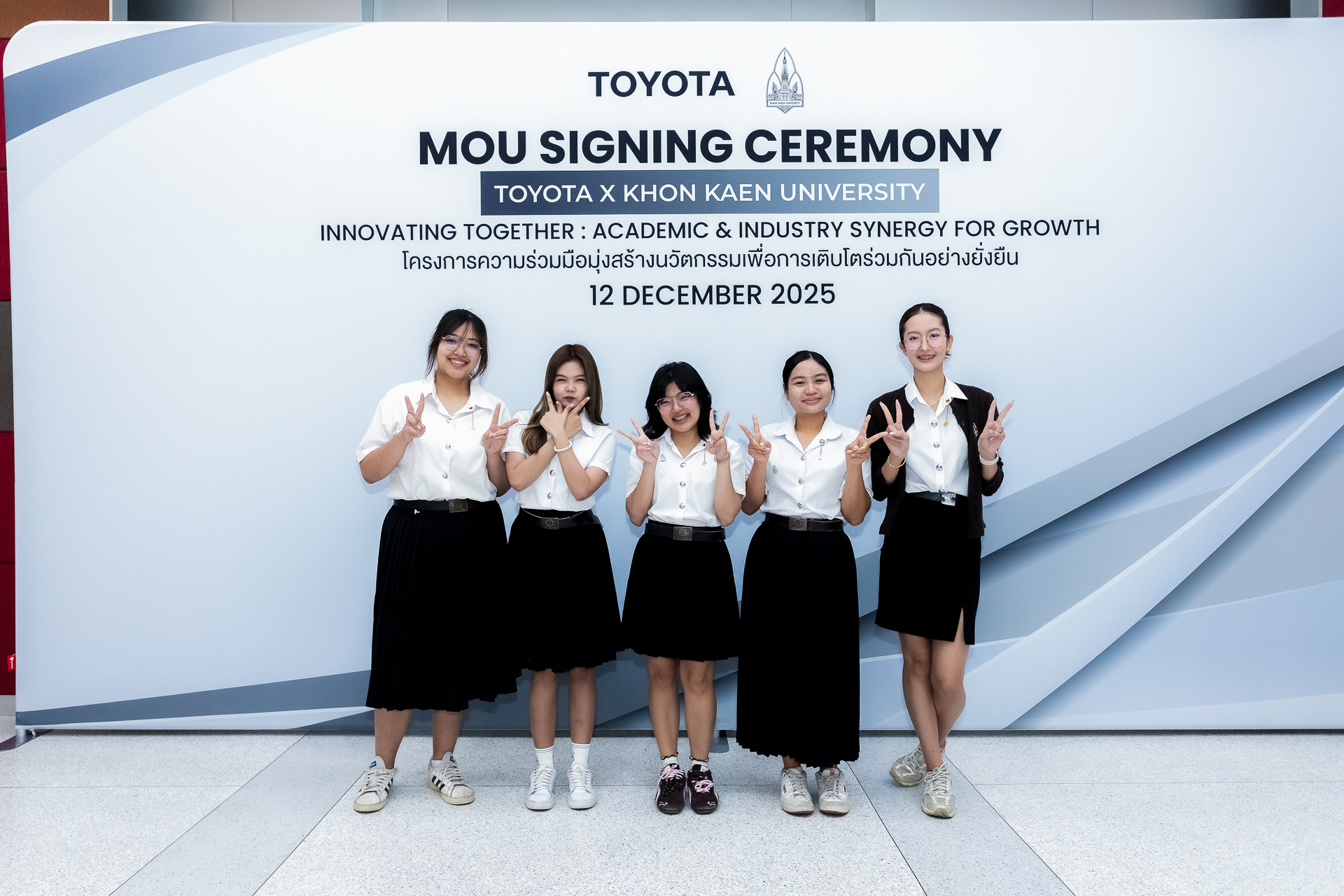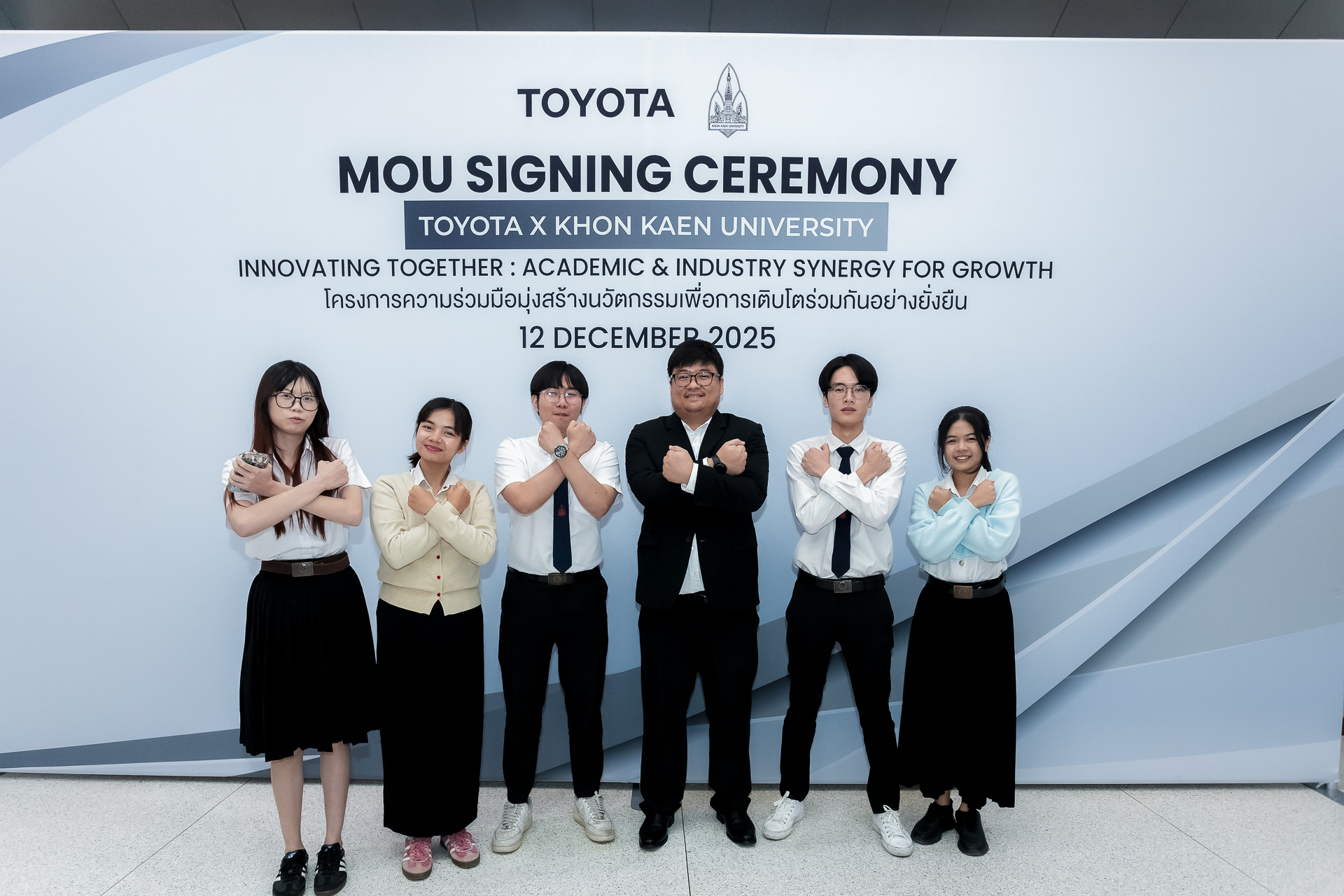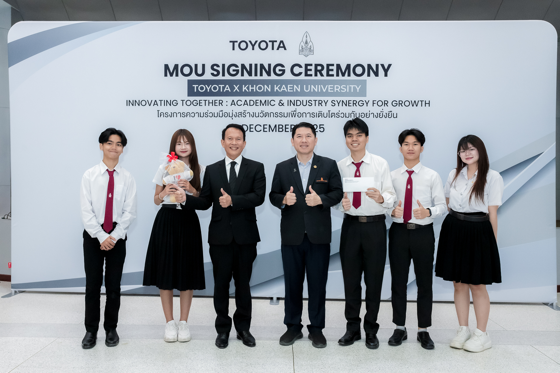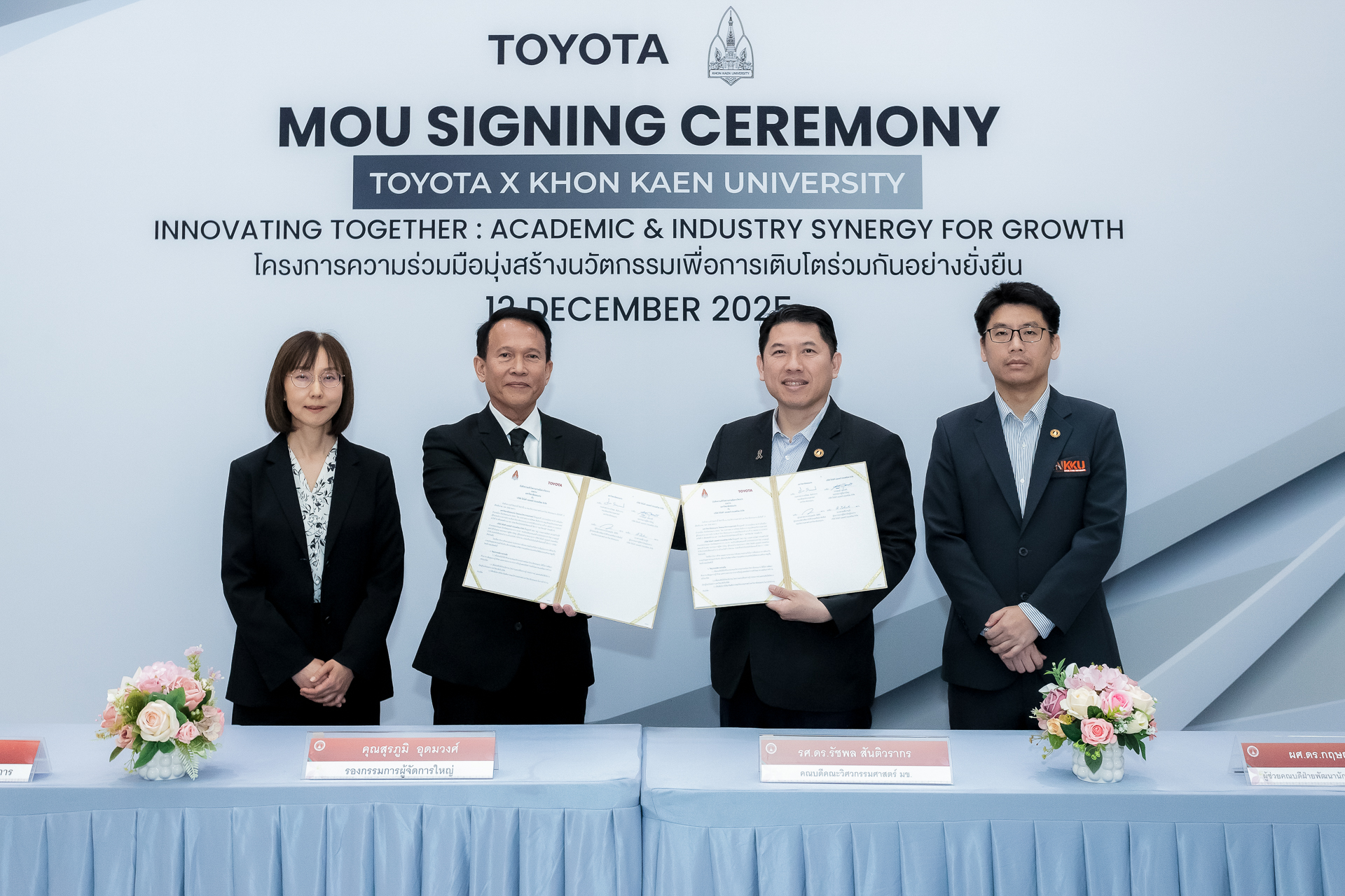 เมื่อ 12 ธันวาคม 2568 ที่ผ่านมา คณะวิศวกรรมศาสตร์ มหาวิทยาลัยขอนแก่น ร่วมกับ บริษัท โตโยต้า มอเตอร์ ประเทศไทย จำกัด จัดพิธีลงนามบันทึกความเข้าใจความร่วมมือทางวิชาการ (MOU) ภายใต้แนวคิด “Innovating Together: Academic & Industry Synergy for Growth” เพื่อส่งเสริมการเรียนรู้และการแลกเปลี่ยนองค์ความรู้ระหว่างภาคการศึกษาและภาคอุตสาหกรรม โดยมีเป้าหมายหลักในการสร้างนวัตกรรมและการพัฒนาทรัพยากรมนุษย์เพื่อการเติบโตอย่างยั่งยืน พิธีลงนามดังกล่าวจัดขึ้น ณ ห้องสัมมนา 1 ชั้น 9 ตึกเพียรวิจิตร คณะวิศวกรรมศาสตร์ มหาวิทยาลัยขอนแก่น โดยได้รับเกียรติจาก รศ. รัชพล สันติวรากร คณบดีคณะวิศวกรรมศาสตร์ และ คุณสุรภูมิ อุดมวงศ์ รองกรรมการผู้จัดการใหญ่ บริษัท โตโยต้า มอเตอร์ ประเทศไทย จำกัด เป็นผู้ลงนามความร่วมมือ ท่ามกลางคณะผู้บริหาร คณาจารย์ และนักศึกษาที่เข้าร่วมเป็นสักขีพยาน รศ. รัชพล สันติวรากร คณบดีคณะวิศวกรรมศาสตร์ กล่าวต้อนรับและเน้นย้ำถึงวิสัยทัศน์ของคณะฯ ที่มุ่งสู่การเป็น “Global Engineering for All” หรือคณะวิศวกรรมศาสตร์ระดับโลกสำหรับทุกคน โดยระบุว่าความร่วมมือกับภาคเอกชนที่เข้มแข็งอย่างโตโยต้า จะเป็นแรงขับเคลื่อนสำคัญในการผลิตบัณฑิตที่มีคุณภาพ และสร้างสรรค์นวัตกรรมที่ตอบโจทย์ความต้องการของประเทศและสังคมโลกได้จริง ทางด้าน คุณสุรภูมิ อุดมวงศ์ รองกรรมการผู้จัดการใหญ่ บริษัท โตโยต้า มอเตอร์ ประเทศไทย จำกัด ได้กล่าวถึงความตั้งใจของโตโยต้าที่ต้องการสร้างสะพานเชื่อมระหว่างประสบการณ์จริงในโลกธุรกิจกับพลังความคิดสร้างสรรค์ของคนรุ่นใหม่ โดยเชื่อมั่นว่า “ห้องเรียนที่ดีที่สุดคือการลงมือทำ” ซึ่งความร่วมมือครั้งนี้ไม่ได้เป็นเพียงการเชื่อมโยงภาคอุตสาหกรรมเข้ากับสถาบันการศึกษา แต่เป็นการปลดล็อกศักยภาพของนักศึกษาเพื่อขับเคลื่อนอนาคตของอุตสาหกรรมยานยนต์ไทย