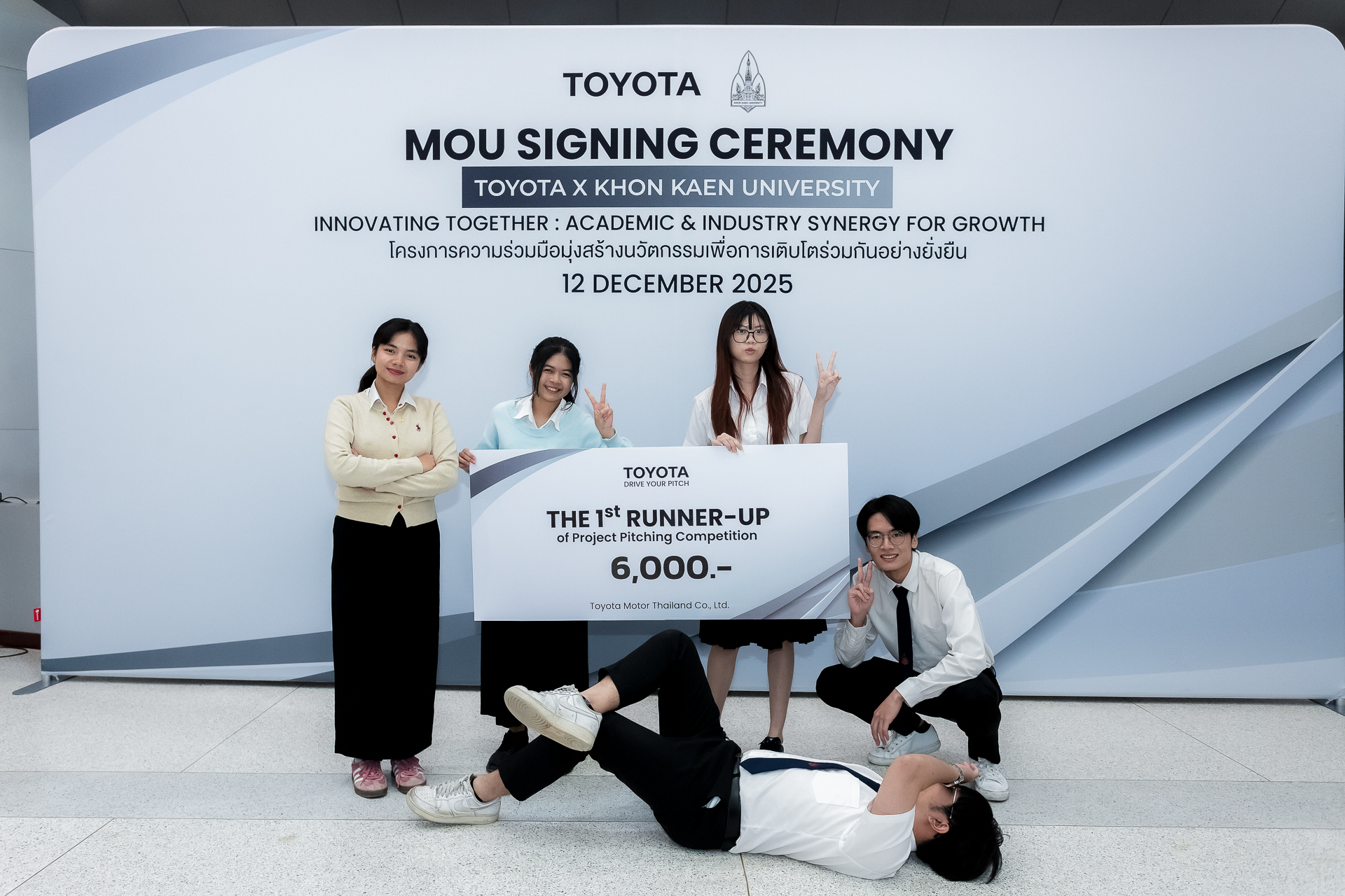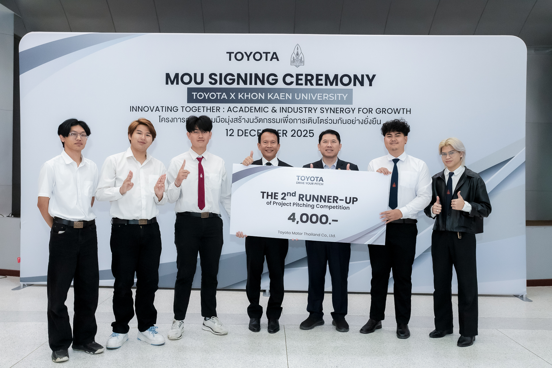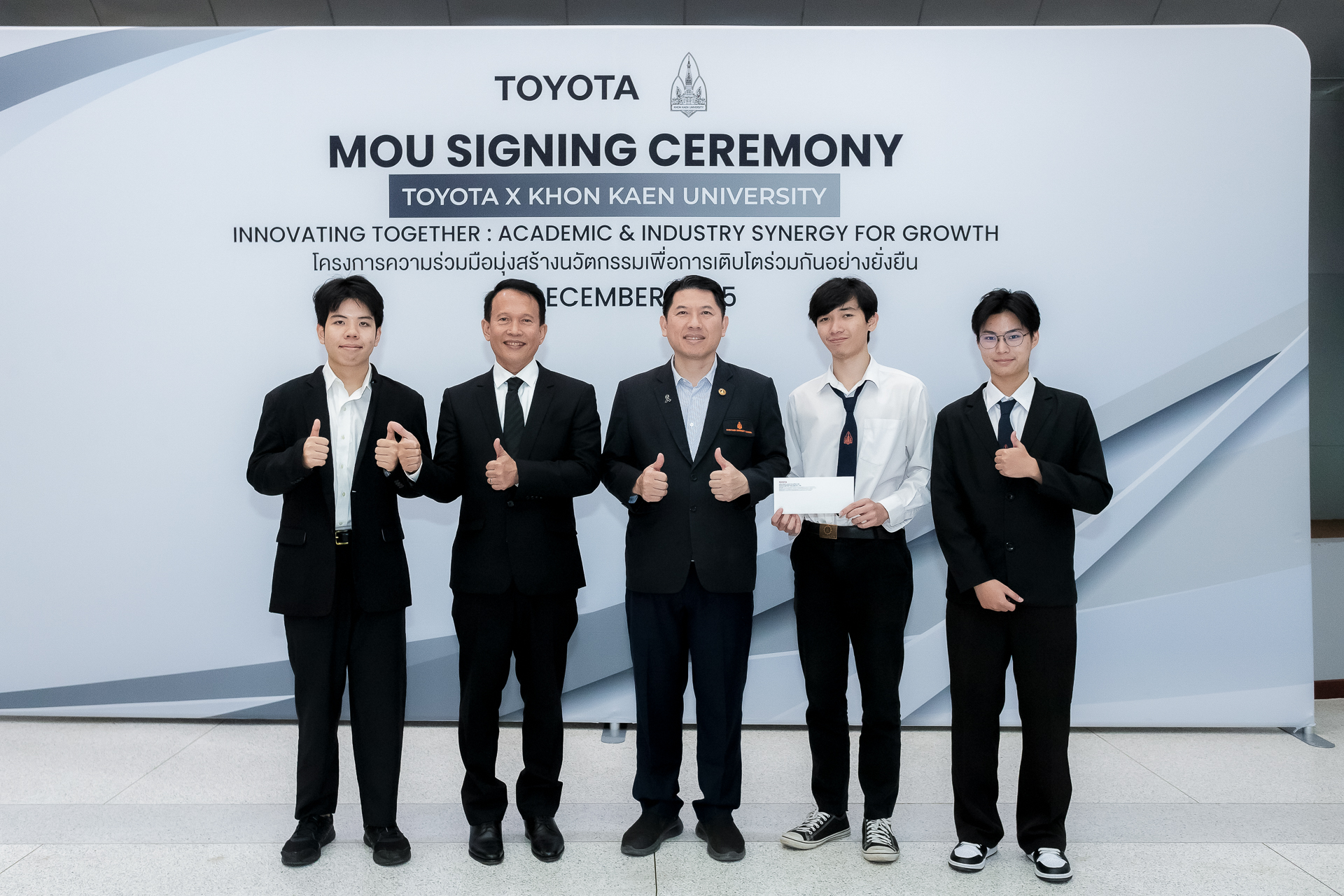 เมื่อ 12 ธันวาคม 2568 ที่ผ่านมา คณะวิศวกรรมศาสตร์ มหาวิทยาลัยขอนแก่น ร่วมกับ บริษัท โตโยต้า มอเตอร์ ประเทศไทย จำกัด จัดพิธีลงนามบันทึกความเข้าใจความร่วมมือทางวิชาการ (MOU) ภายใต้แนวคิด “Innovating Together: Academic & Industry Synergy for Growth” เพื่อส่งเสริมการเรียนรู้และการแลกเปลี่ยนองค์ความรู้ระหว่างภาคการศึกษาและภาคอุตสาหกรรม โดยมีเป้าหมายหลักในการสร้างนวัตกรรมและการพัฒนาทรัพยากรมนุษย์เพื่อการเติบโตอย่างยั่งยืน พิธีลงนามดังกล่าวจัดขึ้น ณ ห้องสัมมนา 1 ชั้น 9 ตึกเพียรวิจิตร คณะวิศวกรรมศาสตร์ มหาวิทยาลัยขอนแก่น โดยได้รับเกียรติจาก รศ. รัชพล สันติวรากร คณบดีคณะวิศวกรรมศาสตร์ และ คุณสุรภูมิ อุดมวงศ์ รองกรรมการผู้จัดการใหญ่ บริษัท โตโยต้า มอเตอร์ ประเทศไทย จำกัด เป็นผู้ลงนามความร่วมมือ ท่ามกลางคณะผู้บริหาร คณาจารย์ และนักศึกษาที่เข้าร่วมเป็นสักขีพยาน รศ. รัชพล สันติวรากร คณบดีคณะวิศวกรรมศาสตร์ กล่าวต้อนรับและเน้นย้ำถึงวิสัยทัศน์ของคณะฯ ที่มุ่งสู่การเป็น “Global Engineering for All” หรือคณะวิศวกรรมศาสตร์ระดับโลกสำหรับทุกคน โดยระบุว่าความร่วมมือกับภาคเอกชนที่เข้มแข็งอย่างโตโยต้า จะเป็นแรงขับเคลื่อนสำคัญในการผลิตบัณฑิตที่มีคุณภาพ และสร้างสรรค์นวัตกรรมที่ตอบโจทย์ความต้องการของประเทศและสังคมโลกได้จริง ทางด้าน คุณสุรภูมิ อุดมวงศ์ รองกรรมการผู้จัดการใหญ่ บริษัท โตโยต้า มอเตอร์ ประเทศไทย จำกัด ได้กล่าวถึงความตั้งใจของโตโยต้าที่ต้องการสร้างสะพานเชื่อมระหว่างประสบการณ์จริงในโลกธุรกิจกับพลังความคิดสร้างสรรค์ของคนรุ่นใหม่ โดยเชื่อมั่นว่า “ห้องเรียนที่ดีที่สุดคือการลงมือทำ” ซึ่งความร่วมมือครั้งนี้ไม่ได้เป็นเพียงการเชื่อมโยงภาคอุตสาหกรรมเข้ากับสถาบันการศึกษา แต่เป็นการปลดล็อกศักยภาพของนักศึกษาเพื่อขับเคลื่อนอนาคตของอุตสาหกรรมยานยนต์ไทย