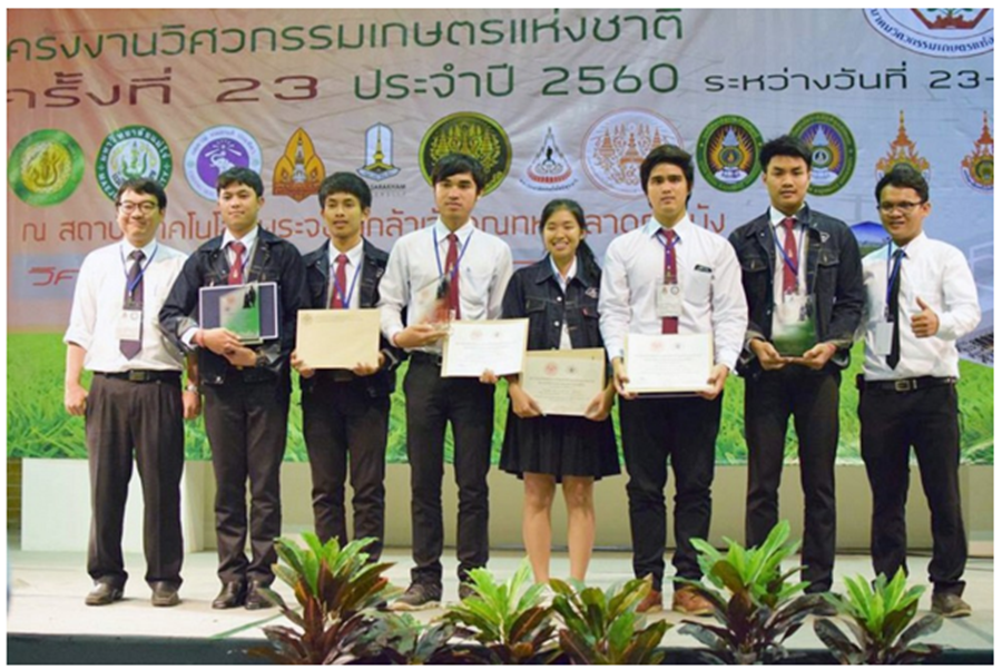 เมื่อวันที่ 23-24 มีนาคม 2560 ผ.ศ.ดร.ชัยยันต์ จันทรศิริ ผศ.ดร.สมโภชน์ สุดาจันทร์ และ ดร.กิตติพงษ์ ลาลุน อาจารย์ภาควิชาวิศวกรรมเกษตร คณะวิศวกรรมศาสตร์ ได้นำนักศึกษาชั้นปีที่ 4 และ ปีที่ 3 เข้าร่วม “การประชุมวิชาการโครงงานวิศวกรรมเกษตรแห่งชาติ ครั้งที่ 23 “ ปี 2560 ณ สถาบันเทคโนโลยีพระจอมเกล้าเจ้าคุณทหารลาดกระบัง โดยมีนักศึกษาจากมหาวิทยาลัยต่าง ๆ 14 สถาบันส่งผลงานโครงงานทางด้านวิศวกรรมเกษตรเข้าร่วมประชุมและเสนอผลงานทั้งภาคอภิปรายปากเปล่าและภาคโปสเตอร์เพื่อประกวดโครงงานนักศึกษา ซึ่งเป็นเวทีที่จัดขึ้นเพื่อให้นักศึกษาในวงการวิชาชีพเดียวกันมีโอกาสนำเสนอผลงานทางวิชาการ แลกเปลี่ยนความรู้ประสบการณ์ และความคิดเห็นทางวิชาการ อันจะส่งผลให้นักศึกษามีแรงผลักดันให้เกิดความมุ่งมั่นที่จะศึกษา ค้นคว้า และผลิตผลงานคุณภาพ ซึ่งจะเป็นการสร้างความเข้มแข็งให้กับโครงงานวิศวกรรมเกษตรได้อีกทางหนึ่ง โดยมี สมาคมวิศวกรรมเกษตรแห่งประเทศไทย สนับสนุน ซึ่งผลงานของนักศึกษา ภาควิชาวิศวกรรมเกษตร มหาวิทยาลัยขอนแก่น ได้รับรางวัล 4 รางวัล: