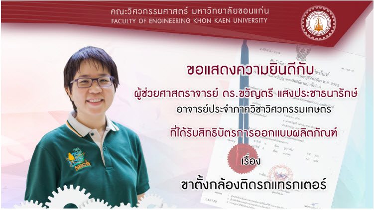ขอแสดงความยินดีกับ ผศ.ดร. ขวัญตรี แสงประชาธนารักษ์ June 23, 2017 985 Facebook Twitter Google LinkedIn Email ขอแสดงความยินดีกับ ผศ.ดร. ขวัญตรี แสงประชาธนารักษ์ อาจารย์ประจำภาควิชาวิศวกรรมเกษตรที่ได้รับสิทธิบัตรการออกแบบผลิตภัณฑ์เรื่องขาตั้งกล้องติดรถแทรกเตอร์ In this article ข่าวสาร