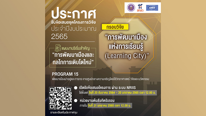 [ประชาสัมพันธ์] บพท. ประกาศรับข้อเสนอโครงการวิจัย กรอบการวิจัย “การพัฒนาเมืองแห่งการเรียนรู้ (Learning City)” ภายใต้แผนงานริเริ่มสำคัญ “การพัฒนาเมืองและกลไกการเติบโตใหม่” ประจำปี 2565 ประกาศรับข้อเสนอชุดโครงการวิจัย ประจำปีงบประมาณ 2565 ————————————— หน่วยบริหารและจัดการทุนด้านการพัฒนาระดับพื้นที่ ประกาศรับข้อเสนอชุดโครงการวิจัย ประจำปีงบประมาณ 2565 Program 15 พัฒนาเมืองน่าอยู่และการกระจายศูนย์กลางความเจริญโดยใช้วิทยาศาสตร์ วิจัยและนวัตกรรม แผนงานริเริ่มสำคัญ “การพัฒนาเมืองและกลไกการเติบโตใหม่” กรอบการวิจัย “การพัฒนาเมืองแห่งการเรียนรู้ (Learning City)”...