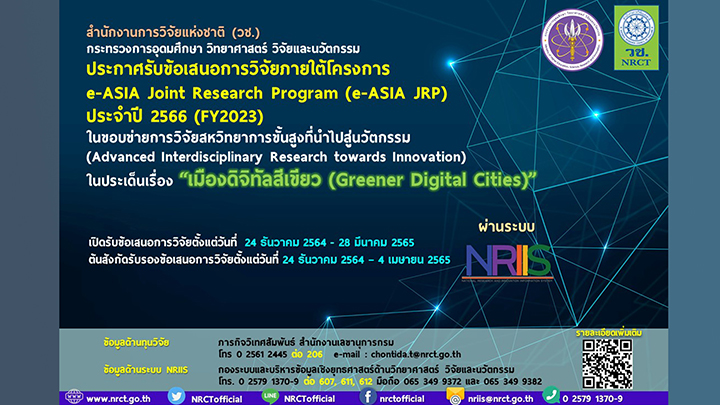 วช. ประกาศรับข้อเสนอการวิจัยภายใต้โครงการ e-ASIA Joint Research Program (e-ASIA JRP) ประจำปี 2566 (FY2023) โครงการ e-ASIA Joint Research Program (e-ASIA JRP) ประจำปี 2566 (FY2023) ขอบข่ายการวิจัยสหวิทยาการขั้นสูงที่นำไปสู่นวัตกรรม (Advanced Interdisciplinary Research towards Innovation) ในประเด็นเรื่อง “เมืองดิจิทัลสีเขียว...