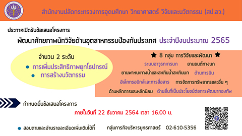 กระทรวงการอุดมศึกษา วิทยาศาสตร์ วิจัยและนวัตกรรม (สป.อว.) เปิดรับข้อเสนอโครงการพัฒนาศักยภาพนักวิจัยด้านอุตสาหกรรมป้องกันประเทศ ประจำปีงบประมาณ 2565 ผู้สนใจสามารถยื่นข้อเสนอโครงการฯ จำนวน 7 เล่ม มายังกลุ่มภารกิจบริหารยุทธศาสตร์ สำนักงานปลัดกระทรวงการอุดมศึกษา วิทยาศาสตร์ วิจัยและนวัตกรรม พร้อมระบุระดับการวิจัยและชื่อกลุ่มโจทย์วิจัยด้านหน้าซองเอกสารให้ชัดเจน กำหนดยื่นข้อเสนอโครงการ ภายในวันที่ 22 ธันวาคม 2564 เวลา 16.00 น. อ่านรายละเอียด และ ดาวน์โหลดเอกสารการยื่น >> https://bit.ly/3duXE8t