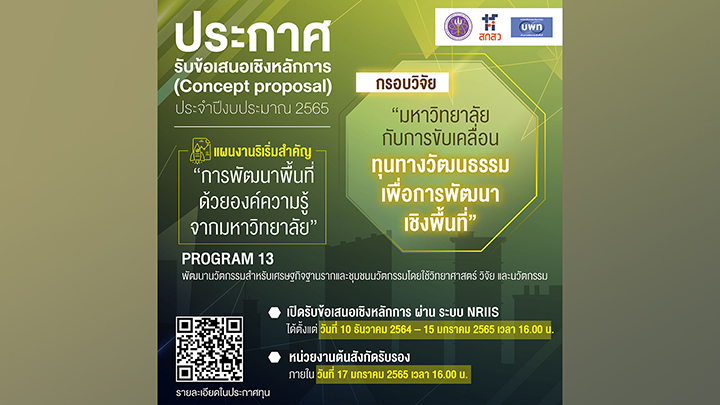 ประกาศรับข้อเสนอเชิงหลักการ (Concept Proposal) ประจำปีงบประมาณ 2565 ————————————— หน่วยบริหารและจัดการทุนด้านการพัฒนาระดับพื้นที่ ประกาศรับข้อเสนอเชิงหลักการ ประจำปีงบประมาณ 2565 Program 13 พัฒนานวัตกรรมสำหรับเศรษฐกิจฐานรากและชุมชนนวัตกรรมโดยใช้วิทยาศาสตร์ วิจัยและนวัตกรรม แผนงานริเริ่มสำคัญ “การพัฒนาพื้นที่ด้วยองค์ความรู้จากมหาวิทยาลัย” กรอบวิจัย “มหาวิทยาลัยกับการขับเคลื่อนทุนทางวัฒนธรรมเพื่อการพัฒนาเชิงพื้นที่” สามารถส่งข้อเสนอเชิงหลักการ ได้ตั้งแต่วันที่ 10 ธันวาคม 2564 – 15 มกราคม 2565...