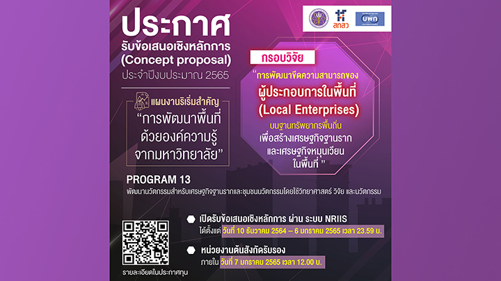 [ประชาสัมพันธ์] บพท. ประกาศรับข้อเสนอเชิงหลักการ (Concept Proposal) ประจำปีงบประมาณ 2565 หน่วยบริหารและจัดการทุนด้านการพัฒนาระดับพื้นที่ ประกาศรับข้อเสนอเชิงหลักการ (Concept Proposal) ประจำปีงบประมาณ 2565 Program 13 พัฒนานวัตกรรมสำหรับเศรษฐกิจฐานรากและชุมชนนวัตกรรมโดยใช้วิทยาศาสตร์ วิจัยและนวัตกรรม แผนงานริเริ่มสำคัญ “การพัฒนาพื้นที่ด้วยองค์ความรู้จากมหาวิทยาลัย” กรอบวิจัย “การพัฒนาขีดความสามารถของผู้ประกอบการในพื้นที่ (Local Enterprises) บนฐานทรัพยากรพื้นถิ่นเพื่อสร้างเศรษฐกิจฐานรากและเศรษฐกิจหมุนเวียนในพื้นที่” สามารถส่งข้อเสนอเชิงหลักการ ได้ตั้งแต่วันที่ 10 ธันวาคม 2564...