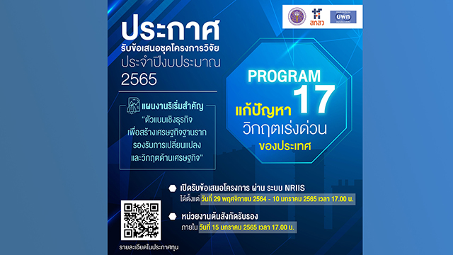 ประกาศรับข้อเสนอชุดโครงการวิจัย ประจำปีงบประมาณ 2565 ————————————— หน่วยบริหารและจัดการทุนด้านการพัฒนาระดับพื้นที่ ประกาศรับข้อเสนอชุดโครงการวิจัย ประจำปีงบประมาณ 2565 Program 17 แก้ปัญหาวิกฤตเร่งด่วนของประเทศ แผนงานริเริ่มสำคัญ “ตัวแบบเชิงธุรกิจเพื่อสร้างเศรษฐกิจฐานรากรองรับการเปลี่ยนแปลงและวิกฤตด้านเศรษฐกิจ” สามารถส่งข้อเสนอชุดโครงการวิจัย ได้ตั้งแต่วันที่ 29 พฤศจิกายน 2564 – 10 มกราคม 2565 เวลา 17.00 น.) (หน่วยงานต้นสังกัดรับรองภายในวันที่ 15 มกราคม 2565...