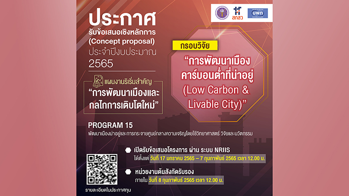 [ประชาสัมพันธ์] บพท. ประกาศรับข้อเสนอเชิงหลักการ (Concept proposal) กรอบการวิจัย “การพัฒนาเมืองคาร์บอนต่ำที่น่าอยู่ (Low Carbon & Livable City)” ภายใต้แผนงานริเริ่มสำคัญ “การพัฒนาเมืองและกลไกการเติบโตใหม่” ประจำปี 2565 ประกาศรับข้อเสนอเชิงหลักการ (Concept Proposal) ประจำปีงบประมาณ 2565 ————————————— หน่วยบริหารและจัดการทุนด้านการพัฒนาระดับพื้นที่ ประกาศรับข้อเสนอเชิงหลักการ (Concept Proposal) ประจำปีงบประมาณ 2565 Program...