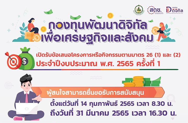 กองทุนพัฒนาดิจิทัลเพื่อเศรษฐกิจและสังคมเปิดรับข้อเสนอโครงการหรือกิจกรรม ตามมาตรา 26 (1) และ (2) ประจำปีงบประมาณ พ.ศ. 2565 ครั้งที่ 1 ภายใต้กรอบนโยบาย 4 ด้าน Digital Agriculture Digital Manpower Digital Government & Infrastructure Digital Technology ช่วงเวลายื่นขอรับทุนได้ตั้งแต่ 14 กุมภาพันธ์ 2565 ...