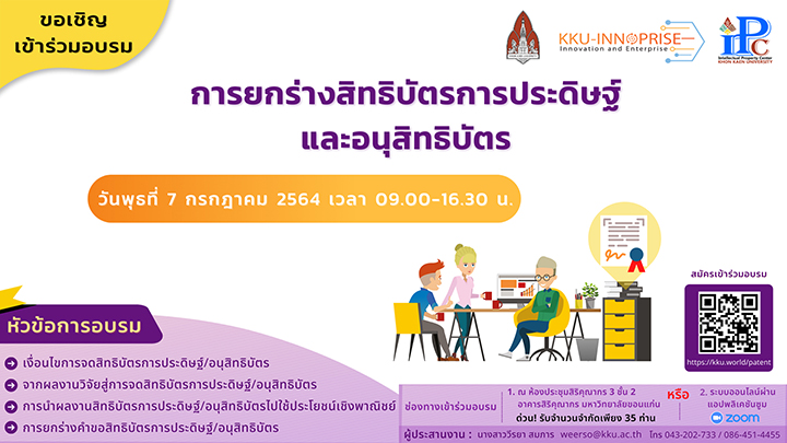 ขอเรียนเชิญทุกท่านเข้าร่วมอบรม “การยกร่างสิทธิบัตรการประดิษฐ์และอนุสิทธิบัตร” จัดโดย ฝ่ายนวัตกรรมและวิสาหกิจ โดยศูนย์ทรัพย์สินทางปัญญา มหาวิทยาลัยขอนแก่น ในพุธวันที่ 7 กรกฎาคม 2564 เวลา 09.00-16.30 น. ท่านสามารถเข้าร่วมได้ 2 ช่องทาง ดังนี้ 1. Onsite ณ ห้องสิริคุณากร 3 อาคารสิริคุณากร มข. รับจำนวนจำกัด เพียง 35 ท่านเท่านั้น! 2....