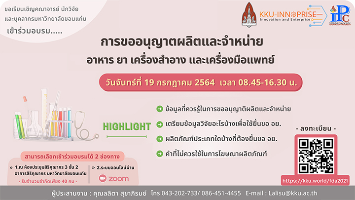 ขอเชิญคณาจารย์ และนักวิจัยมหาวิทยาลัยขอนแก่น เข้าร่วมอบรม เรื่อง การขออนุญาตผลิตและจำหน่ายอาหาร ยา เครื่องสำอาง และเครื่องมือแพทย์ วันจันทร์ที่ 19 กรกฎาคม 2564 เวลา 08.45 – 16.30 น. จัดโดยศูนย์ทรัพย์สินทางปัญญา มข. _________________________________ สามารถเลือกเข้าร่วมอบรมได้ 2 ช่องทาง 1. ณ ห้องประชุมสิริคุณากร 3 มหาวิทยาลัยขอนแก่น 2....