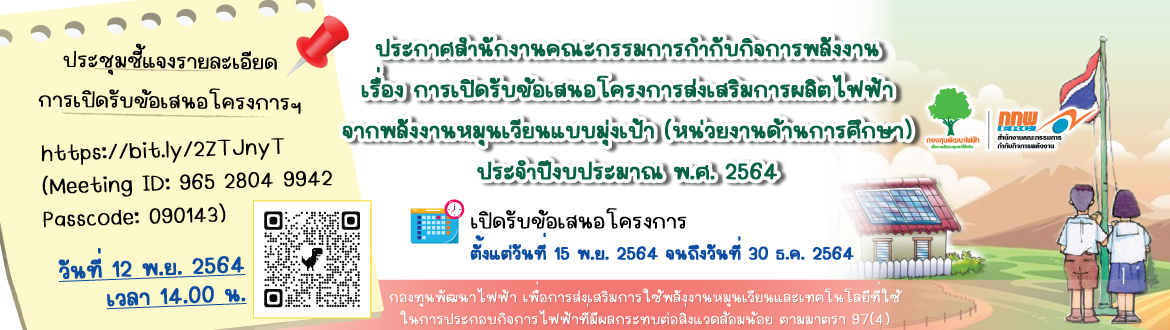 [ประชาสัมพันพันธ์] สำนักงานคณะกรรมการกำกับกิจการพลังงานเปิดรับข้อเสนอโครงการส่งเสริมการผลิตไฟฟ้าจากพลังงานหมุนเวียนแบบมุ่งเป้า (หน่วยงานด้านการศึกษา) ประจำปีงบประมาณ พ.ศ.2564 ประกาศ!! เปิดรับข้อเสนอโครงการส่งเสริมการผลิตไฟฟ้าจากพลังงานหมุนเวียนแบบมุ่งเป้า (หน่วยงานด้านการศึกษา) ประจำปีงบประมาณ พ.ศ. 2564 สามารถยื่นข้อเสนอโครงการฯ ได้ตั้งแต่วันที่ 15 พฤศจิกายน 2564 จนถึงวันที่ 30 ธันวาคม 2564 การติดตั้งระบบผลิตไฟฟ้าจากพลังงานแสงอาทิตย์สำหรับหน่วยงานการศึกษาในพื้นที่ห่างไกลไฟฟ้า (Off-grid) โดยมีโรงเรียนกลุ่มเป้าหมายในสังกัดของกระทรวงศึกษาธิการในพื้นที่ี่ห่างไกลระบบสายส่งไฟฟ้า ประกอบด้วย 2 กลุ่ม ดังนี้ (ก) สำรวจพร้อมติดตั้งระบบฯ...