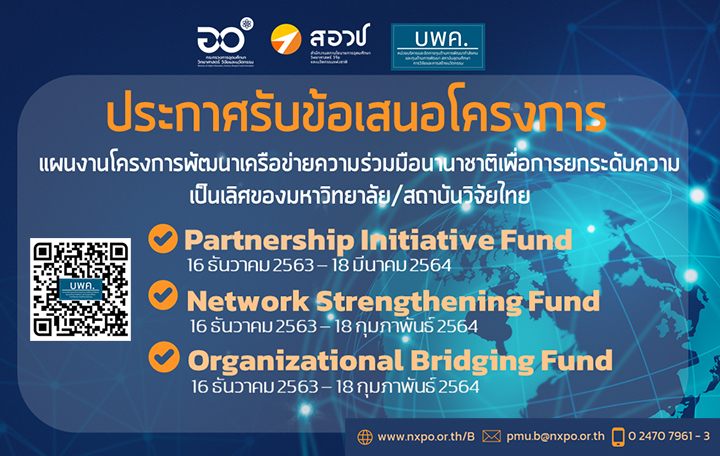 [ประชาสัมพันธ์] บพค. ประกาศรับข้อเสนอโครงการภายใต้โปรแกรมที่ 16 แผนงานพัฒนาเครือข่ายความร่วมมือนานาชาติเพื่อการยกระดับความเป็นเลิศของมหาวิทยาลัย/สถาบันวิจัยไทย หน่วยบริหารและจัดการทุนด้านการพัฒนากำลังคน และทุนด้านการพัฒนาสถาบันอุดมศึกษา การวิจัยและการสร้างนวัตกรรม (บพค.) โปรแกรมที่ 16 การปฏิรูประบบการอุดมศึกษา วิทยาศาสตร์ วิจัยและนวัตกรรม โครงการพัฒนาเครือข่ายความร่วมมือนานาชาติเพื่อการยกระดับความเป็นเลิศของมหาวิทยาลัย/สถาบันวิจัยไทย หัวข้อการสนับสนุน – การพัฒนาเครือข่ายความร่วมมือกับกับนานาชาติ ด้านวิทยาศาสตร์ เทคโนโลยี และนวัตกรรม ระดับ Organizational Bridging Fund : S&T – การพัฒนาเครือข่ายความร่วมมือกับนานาชาติ...