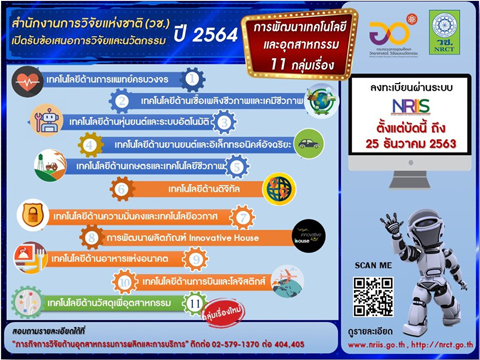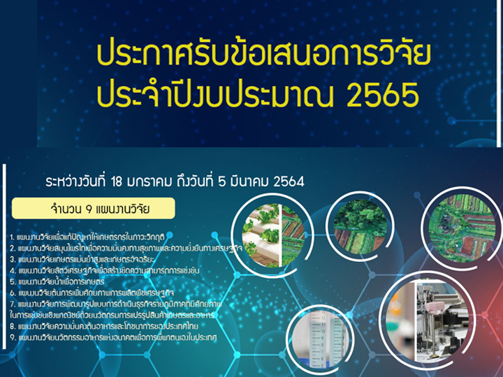 [ประชาสัมพันธ์] สำนักงานพัฒนาการวิจัยการเกษตร (องค์การมหาชน) ประกาศรับข้อเสนอแผนงานวิจัย ประจำปีงบประมาณ 2565 สำนักงานพัฒนาการวิจัยการเกษตร (องค์การมหาชน) ประกาศรับข้อเสนอแผนงานวิจัย ประจำปีงบประมาณ 2565 ได้กำหนดกรอบงานวิจัยที่ประสงค์จะเปิดรับข้อเสนอโครงการ จำนวน 9 แผนงานวิจัย (รายละเอียดตามลิงค์ที่แนบแต่ละแผนงาน) ประกอบด้วย 1. แผนงานวิจัยเพื่อแก้ปัญหาให้เกษตรกรในภาวะวิกฤติ ➭ https://nriis.nrct.go.th/NewsEventDetail.aspx?nid=8369 2. แผนงานวิจัยสมุนไพรไทยเพื่อความมั่นคงทางสุขภาพและความยั่งยืนทางเศรษฐกิจ ➭ https://nriis.nrct.go.th/NewsEventDetail.aspx?nid=8364 3. แผนงานวิจัยเกษตรแม่นยำสูงและเกษตรอัจฉริยะ ➭ https://nriis.nrct.go.th/NewsEventDetail.aspx?nid=8366...