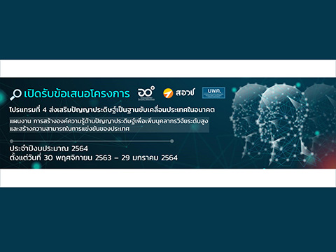 [ประชาสัมพันธ์] บพค. เปิดรับข้อเสนอโครงการภายใต้โปรแกรมที่ 4 แผนงาน “การสร้างองค์ความรู้ด้านปัญญาประดิษฐ์เพื่อเพิ่มบุคลากรวิจัยระดับสูงและ สร้างความสามารถในการแข่งขันของประเทศ” ปีงบประมาณ 2564 บพค. เปิดรับข้อเสนอโครงการ แผนงานการสร้างองค์ความรู้ด้านปัญญาประดิษฐ์เพื่อเพิ่มบุคลากรวิจัยระดับสูงและ สร้างความสามารถในการแข่งขันของประเทศ ภายใต้โปรแกรมที่ 4 ส่งเสริมปัญญาประดิษฐ์เป็นฐานขับเคลื่อนประเทศในอนาคต ประจำปีงบประมาณ 2564 ช่วงเวลาเปิดรับข้อเสนอ : ตั้งแต่บัดนี้ – 29 มกราคม 2564 เวลา 16.30 น. (ยื่นข้อเสนอโครงการในระบบ...
