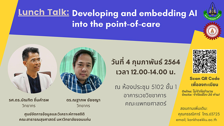 ขอเชิญเข้าร่วมฟังการเสวนาประเด็นวิจัยทางการแพทย์ในโครงการ Lunch Talk หัวข้อ “Developing and embedding AI into the point-of-care” ด้วย คณะวิศวกรรมศาสตร์ร่วมกับคณะแพทยศาสตร์ ได้กำหนดจัดการเสวนาประเด็นวิจัยทางการแพทย์ในโครงการ LUNCH TALK ในหัวข้อ “Developing and embedding AI into the point-of-care” วันพฤหัสบดีที่ 4 กุมภาพันธ์ 2564 เวลา...