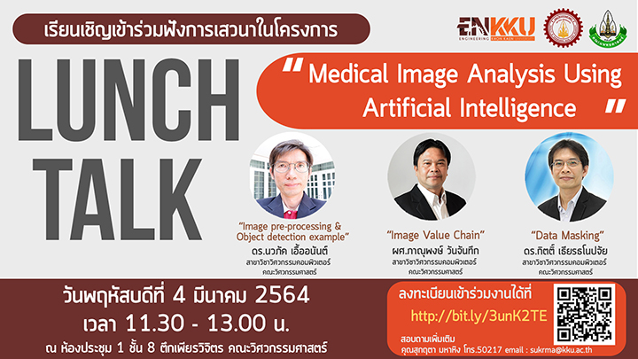 [[ประชาสัมพันธ์]] ขอเชิญเข้าร่วมฟังการเสวนาในโครงการ Lunch Talk หัวข้อ “Medical Image Analysis Using Artificial Intelligence” คณะวิศวกรรมศาสตร์ ร่วมกับ คณะแพทยศาสตร์ ได้กำหนดจัดการเสวนาประเด็นวิจัยทางการแพทย์ในโครงการ LUNCH TALK ในหัวข้อ “Medical Image Analysis Using Artificial Intelligence” ...