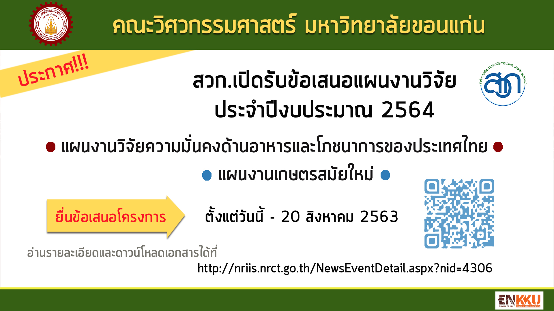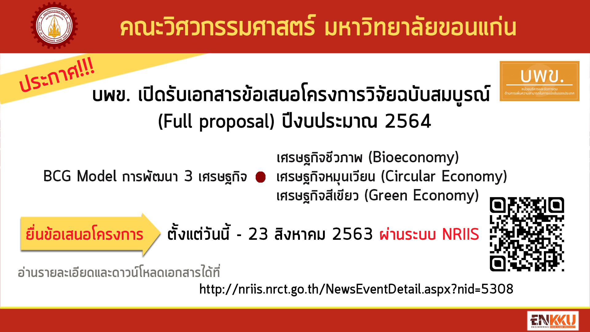 [ประชาสัมพันธ์] บพข. ประกาศรับเอกสารข้อเสนอโครงการวิจัยฉบับสมบูรณ์ (Full proposal) ปีงบประมาณ 2564 หน่วยบริหารและจัดการทุนด้านการเพิ่มความสามารถในการแข่งขันของประเทศ (บพข.) ประกาศรับเอกสารข้อเสนอโครงการวิจัยฉบับสมบูรณ์ (Full proposal) ปีงบประมาณ 2564 ในกรอบการวิจัยภายใต้แพลตฟอร์มที่ 3 การวิจัยและนวัตกรรมเพื่อเพิ่มขีดความสามารถในการแข่งขัน โปรแกรมที่ 10 ยกระดับความสามารถการแข่งขันและวางรากฐานทางเศรษฐกิจด้าน BCG in Action โดยเป็นการพัฒนา 3 เศรษฐกิจ คือ เศรษฐกิจชีวภาพ (Bioeconomy),...