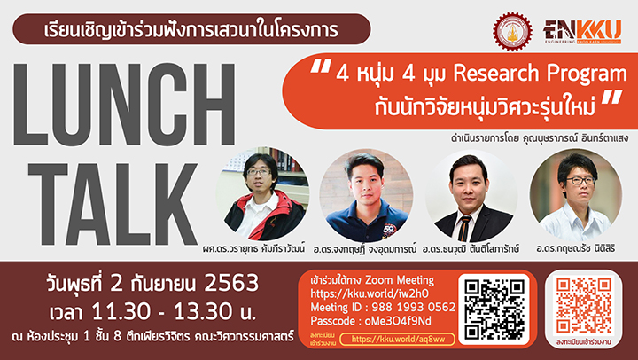 [[ประชาสัมพันธ์]] ขอเชิญเข้าร่วมฟังการเสวนาในโครงการ Lunch Talk หัวข้อ “4 หนุ่ม 4 มุม Research Program กับนักวิจัยหนุ่มวิศวะรุ่นใหม่” ด้วย คณะวิศวกรรมศาสตร์ ได้กำหนดจัดโครงการ Lunch talk การเสวนาในหัวข้อ “4 หนุ่ม 4 มุม Research Program กับนักวิจัยหนุ่มวิศวะรุ่นใหม่” ขึ้น ในวันพุธที่ 2 กันยายน...