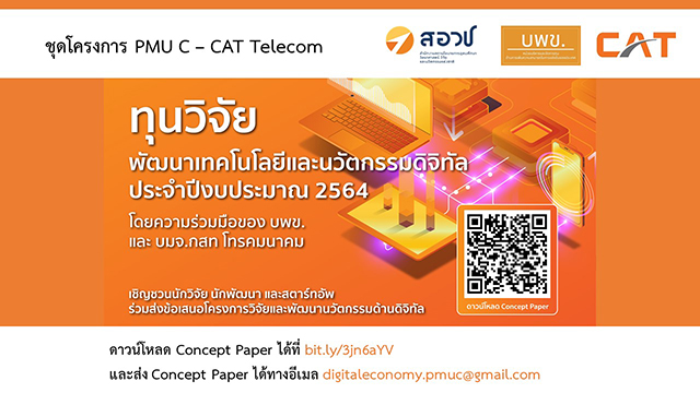 [ประชาสัมพันธ์] ทุนวิจัย พัฒนาเทคโนโลยีและนวัตกรรมดิจิทัล ประจำปีงบประมาณ 2564 โดยความร่วมมือของ บพข. และ บมจ. กสท โทรคมนาคม (กรอบวิจัย) แพลตฟอร์มดิจิทัลสำหรับการผลิต การค้า การบริการ และอื่น ๆ ที่เกี่ยวข้องกับ เทคโนโลยี Internet of Things เทคโนโลยี LoRaWAN เทคโนโลยี Cellular Broadband Internet Access...