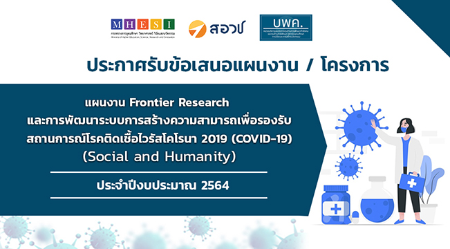 [ประชาสัมพันธ์] บพค. เปิดรับข้อเสนอแผนงาน/โครงการวิจัย ประจำปีงบประมาณ 2564 “แผนงาน Frontier Research และการพัฒนาระบบการสร้างความสามารถ บพค. เปิดรับข้อเสนอแผนงาน/โครงการวิจัย ประจำปีงบประมาณ 2564 “แผนงาน Frontier Research และการพัฒนาระบบการสร้างความสามารถ เพื่อรองรับสถานการณ์โรคติดเชื้อไวรัสโคโรนา 2019 (COVID-19)” (Social and Humanity) ภายใต้โปรแกรมที่ 17 การแก้ปัญหาวิกฤตของประเทศ เนื้อความ : บพค....