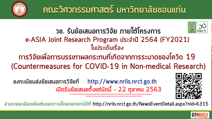 [[ประชาสัมพันธ์]] วช เปิดรับสมัครข้อเสนอการวิจัยภายใต้โครงการ e-ASIA Joint Research Program (e-ASIA JRP) ประจำปี 2564 (FY2021) ในประเด็นเรื่อง “การวิจัยเพื่อการบรรเทาผลกระทบที่เกิดจากการระบาดของโควิด 19 (Countermeasures for COVID-19 in Non-medical” Research) มีวัตถุประสงค์เพื่อส่งเสริมให้นักวิจัยได้มีโอกาสพัฒนาเครือข่ายความร่วมมือทางการวิจัยกับต่างประเทศเพื่อนำไปสู่การป้องกัน และบรรเทาผลกระทบที่เกิดจากการระบาดของของโควิด 19 โดยมุ่งหวังว่าความร่วมมือระหว่างนักวิจัยจากประเทศสมาชิก e-ASIA อ่านรายละเอียดและดาวน์โหลดเอกสารได้ที่ http://nriis.nrct.go.th/NewsEventDetail.aspx?nid=6315 ลงทะเบียนส่งข้อเสนอการวิจัยที่...