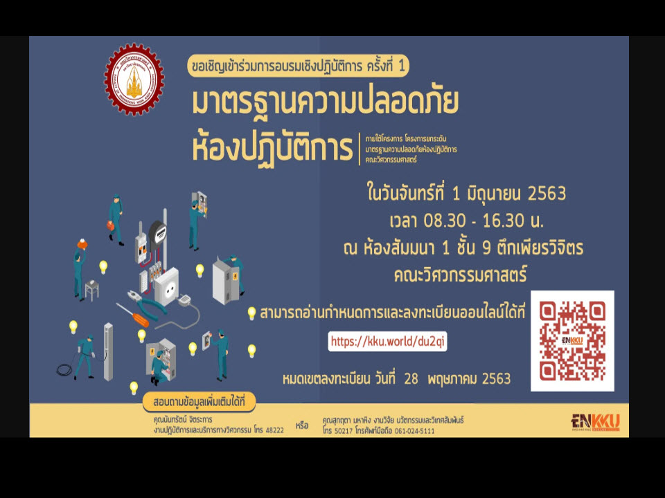 [[ประชาสัมพันธ์]] ขอเชิญเข้าร่วมการอบรมเชิงปฏิบัติการ เรื่อง มาตรฐานความปลอดภัยห้องปฏิบัติการ ภายใต้โครงการยกระดับมาตรฐานความปลอดภัยในห้องปฏิบัติการ คณะวิศวกรรมศาสตร์ ขอเชิญเข้าร่วมการอบรมเชิงปฏิบัติการ เรื่อง มาตรฐานความปลอดภัยห้องปฏิบัติการ ภายใต้โครงการยกระดับมาตรฐานความปลอดภัยในห้องปฏิบัติการ คณะวิศวกรรมศาสตร์ ในวันจันทร์ที่ 1 มิถุนายน 2563 เวลา 08.30 – 16.30 น. ณ ห้องสัมมนา 1 ชั้น 9 ตึกเพียรวิจิตร คณะวิศวกรรมศาสตร์ เพื่อส่งเสริมสนับสนุนให้บุคลากร นักศึกษามีความรู้ความเข้าใจด้านการจัดการความปลอดภัยห้องปฏิบัติการเพิ่มมากขึ้น...