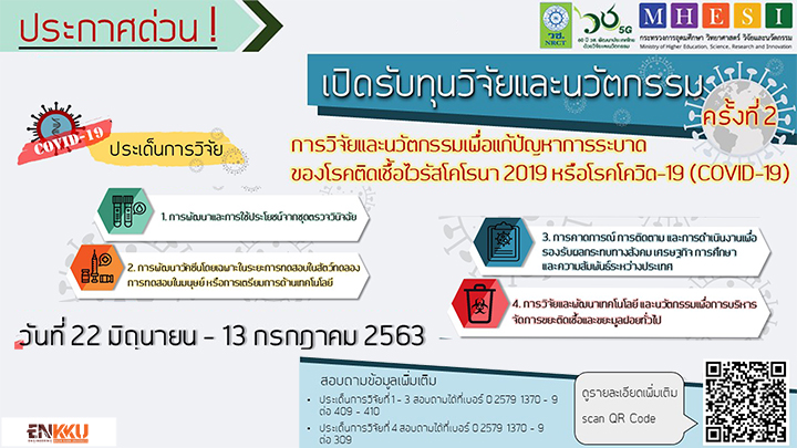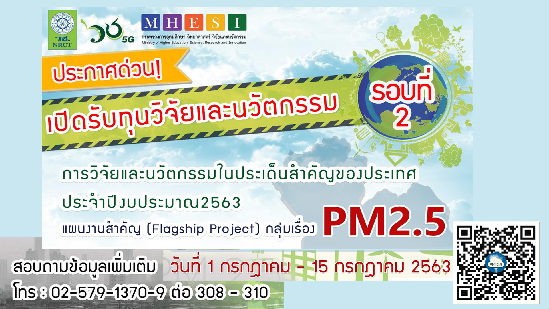 ประกาศด่วน!!! วช. เปิดรับข้อเสนอการวิจัยและนวัตกรรมในประเด็นสำคัญของประเทศ ประจำปีงบประมาณ 2563 แผนงานสำคัญ (Flagship Project) กลุ่มเรื่อง PM2.5 รอบที่ 2 สำนักงานการวิจัยแห่งชาติ (วช.) ได้เปิดรับข้อเสนอการวิจัยและนวัตกรรมในประเด็นสำคัญของประเทศ ประจำปีงบประมาณ 2563 แผนงานสำคัญ (Flagship Project) กลุ่มเรื่อง PM 2.5 รอบที่ 2 โดยมีประเด็นการวิจัย ดังนี้ 1. การวิจัยเชิงลึกด้านพฤติกรรมของคน/ชุมชนในพื้นที่ที่มีการเผาต่อเนื่อง...