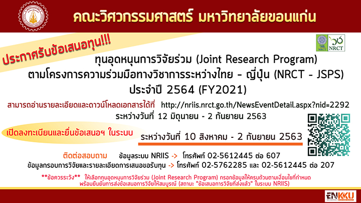 [[ประชาสัมพันธ์]] การเปิดรับข้อเสนอทุนอุดหนุนการวิจัยร่วม (Joint Research Program) ตามโครงการความร่วมมือทางวิชาการระหว่างไทย – ญี่ปุ่น (NRCT – JSPS) ประจำปี 2564 (FY2021) สำนักงานการวิจัยแห่งชาติ (วช.) ได้เปิดรับข้อเสนอการวิจัยภายใต้ทุนอุดหนุนการวิจัยร่วม (Joint Research Program) ตามโครงการความร่วมมือทางวิชาการระหว่างไทย – ญี่ปุ่น (NRCT – JSPS) ประจำปี 2564...
