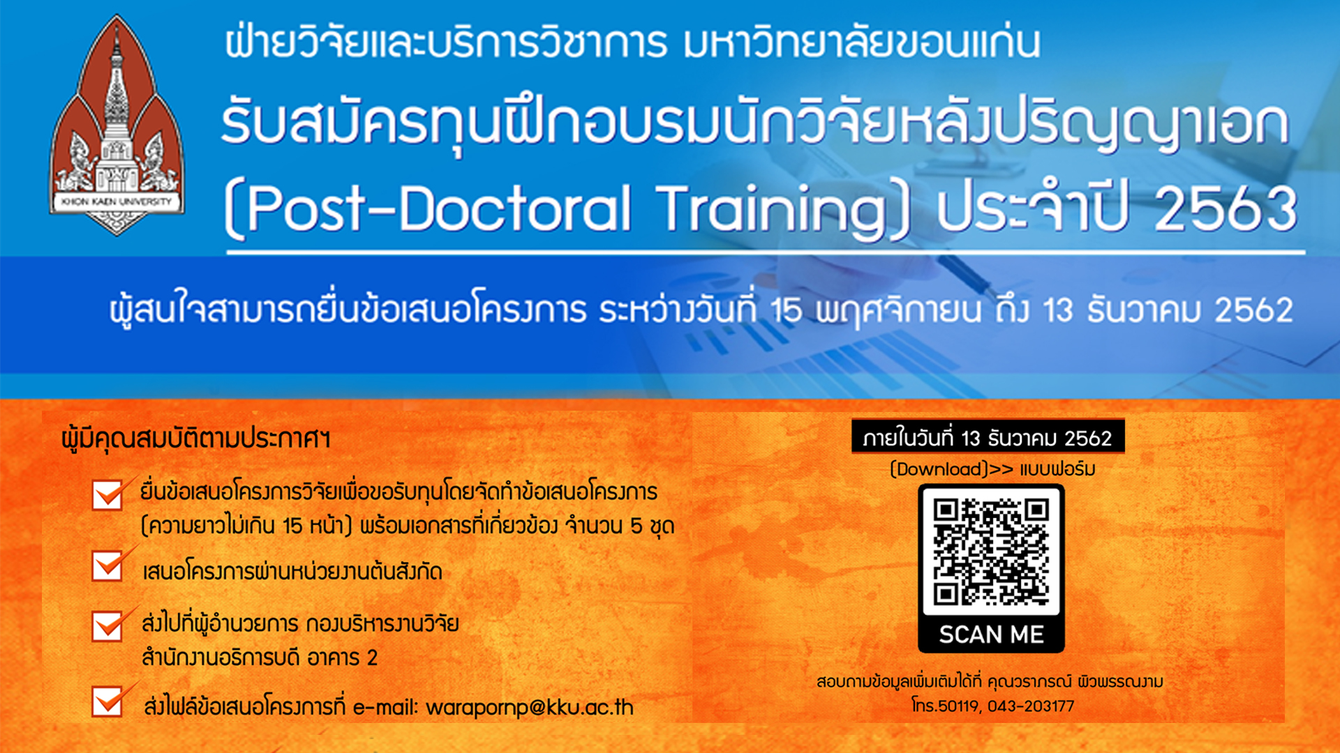 [[ประชาสัมพันธ์]] การรับสมัครทุนฝึกอบรมนักวิจัยหลังปริญญาเอก (Post-Doctoral Training) ประจำปี 2563 ฝ่ายวิจัยและบริการวิชาการ โดย กองบริหารงานวิจัย ได้กำหนดจัดโครงการฝึกอบรมหลังปริญญาเอก (Post-Doctoral Training) โดยมีวัตถุประสงค์เพื่อพัฒนาบุคคลหลังจบการศึกษาปริญญาเอกหรือเทียบเท่า ให้มีความสามารถด้านการวิจัยและเพื่อเข้าสู่อาชีพนักวิจัยหรือเป็นนักวิชาการ ซึ่งประกาศรับสมัครทุนฝึกอบรมหลังปริญญาเอก (Post-Doctoral Training) ระหว่างวันที่ 15 พฤศจิกายน ถึง 13 ธันวาคม 2562 โดยยื่นข้อเสนอโครงการวิจัยเพื่อสมัครขอรับทุน...