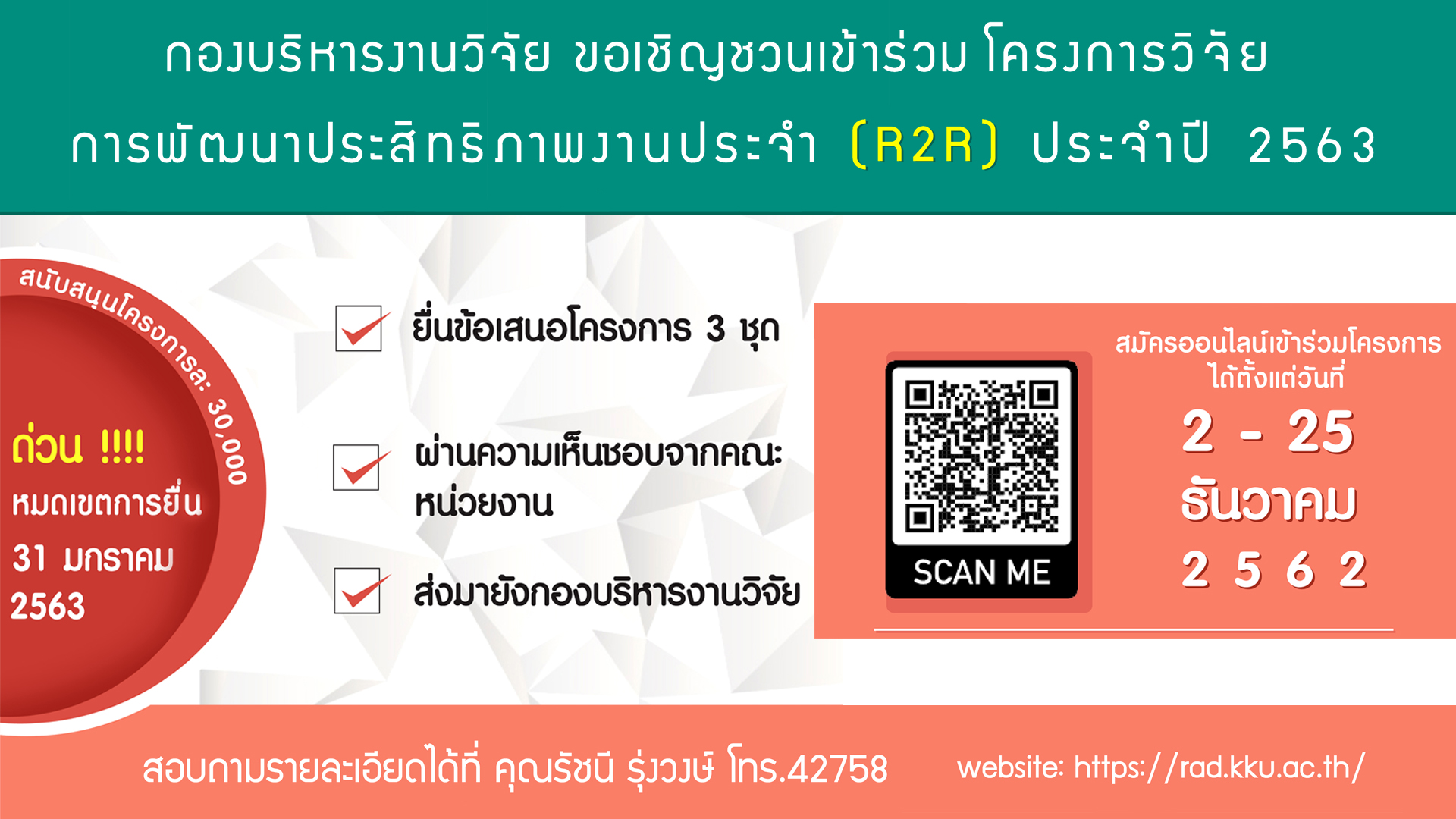 ??ประชาสัมพันธ์?? โครงการวิจัยการพัฒนาประสิทธิภาพงานประจำ (Routine to Research) ปี 2563 กองบริหารงานวิจัย มหาวิทยาลัยขอนแก่น รับสมัครบุคลากรเข้าร่วมโครงการวิจัยพัฒนาประสิทธิภาพงานประจำ (R2R) ประจำปีงบประมาณ 2563 ผู้สนใจสามารถอ่านรายละเอียดเพิ่มเติมได้ที่ https://rad.kku.ac.th/index.asp?go2=institutional ลงทะเบียนเข้าร่วมโครงการได้ที่ https://shorturl.at/ipsQZ ตั้งแต่วันที่ 2-25 ธันวาคม 2562