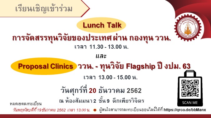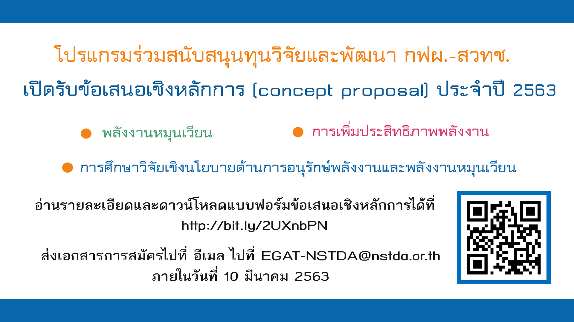 ??ประชาสัมพันธ์?? โปรแกรมร่วมสนับสนุนทุนวิจัยและพัฒนา กฟผ.-สวทช. เปิดรับข้อเสนอเชิงหลักการ (concept proposal) ประจำปี 2563 โดยมีวัตถุประสงค์เพื่อสนับสนุนให้เกิดการวิจัยและพัฒนาเทคโนโลยีด้านพลังงานที่ใช้ในกิจการไฟฟ้า ให้เกิดความมั่นคงด้านพลังงาน ลดการนำเข้าเทคโนโลยีจากต่างประเทศ และการใช้ไฟฟ้าอย่างมีประสิทธิภาพสูงสุด ผู้สนใจสามารถอ่านรายละเอียดได้ที่ https://www.nstda.or.th/th/news/13009-egat-nstda-research-funding-program-2563 ?ส่งเอกสารเชิงหลักการ ไปที่ EGAT-NSTDA@nstda.or.th ภายในวันที่ 10 มีนาคม 2563