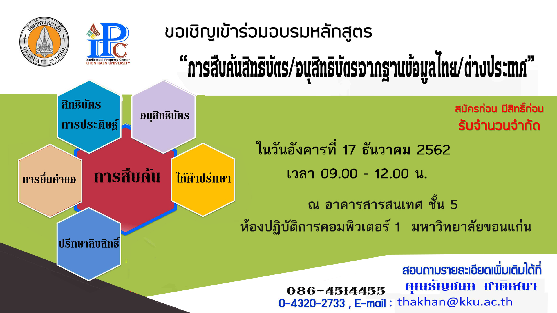 ??ประชาสัมพันธ์?? ขอเชิญเข้าร่วมอบรม เรื่อง “การสืบค้นสิทธิบัตรและอนุสิทธิบัตรจากฐานข้อมูลไทย/ต่างประเทศ “ ฟรี !!! รับจำนวนจำกัด!! ในวันอังคารที่ 17 ธันวาคม 2562 เวลา 09.00 – 12.00 น. ณ อาคารสารสนเทศ ชั้น 5 ห้องปฏิบัติการคอมพิวเตอร์ 1 มหาวิทยาลัยขอนแก่น ? ผู้สนใจลงทะเบียนได้ที่ https://ip.kku.ac.th/register1.html