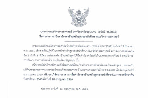 ขยายเวลายื่นคำร้องขอย้ายหลักสูตรของนักศึกษาคณะวิศวกรรมศาสตร์