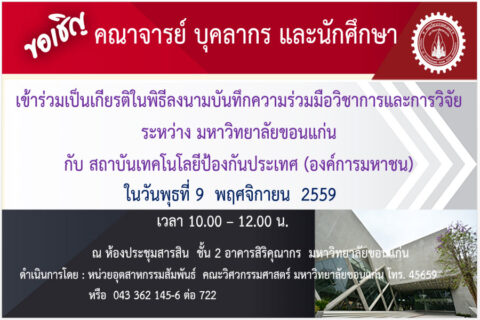 ระหว่าง มหาวิทยาลัยขอนแก่น กับ สถาบันเทคโนโลยีป้องกันประเทศ (องค์การมหาชน) วันพุธที่ 9 พฤศจิกายน 2559 เวลา 10.00-12.00 น. ณ ห้องประชุมสารสิน ชั้น 2...