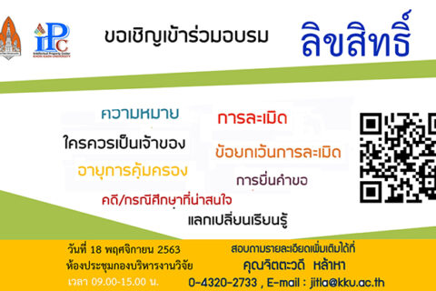 [[ประชาสัมพันธ์]] ขอเชิญเข้าร่วมโครงการอบรม “ลิขสิทธิ์” ศูนย์ทรัพย์สินทางปัญญา มข. ขอเชิญ อาจารย์ นักศึกษา นักวิจัย บุคลากรมหาวิทยาลัยขอนแก่น เข้าร่วมโครงการ การอบรม “ลิขสิทธิ์” ในวันพุธที่ 18...