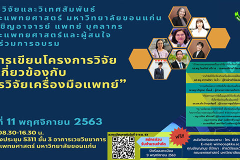 ขอเชิญผู้สนใจเข้าร่วมโครงการอบรม เรื่อง “การเขียนโครงการวิจัยที่เกี่ยวข้องกับการวิจัยเครื่องมือแพทย์” จัดโดย ฝ่ายวิจัยและวิเทศสัมพันธ์ คณะแพทยศาสตร์ มหาวิทยาลัยขอนแก่น ในวันพุธที่ 11 พฤศจิกายน 2563 เวลา 08.30-16.00 น. ณ...