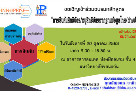 ?? ประชาสัมพันธ์โครงการอบรม การสืบค้นสิทธิบัตร/อนุสิทธิบัตรจากฐานข้อมูลไทยและต่างประเทศ ?? ขอเชิญ อาจารย์ นักศึกษา นักวิจัย บุคลากรมหาวิทยาลัยขอนแก่น เข้าร่วมโครงการการอบรม การสืบค้นสิทธิบัตร/อนุสิทธิบัตรจากฐานข้อมูลไทยและต่างประเทศ จัดโดย ศูนย์ทรัพย์สินทางปัญญา มข. ในวันอังคารที่...
