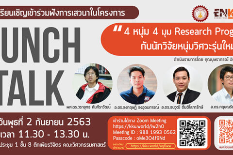 [[ประชาสัมพันธ์]] ขอเชิญเข้าร่วมฟังการเสวนาในโครงการ Lunch Talk หัวข้อ “4 หนุ่ม 4 มุม Research Program กับนักวิจัยหนุ่มวิศวะรุ่นใหม่”