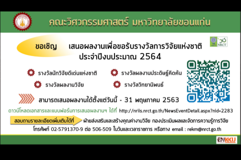[[ประชาสัมพันธ์]] ขอเชิญเสนอผลงานเพื่อขอรับรางวัลการวิจัยแห่งชาติ ประจำปีงบประมาณ 2564