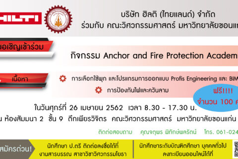 ประชาสัมพันธ์ กิจกรรม “Anchor & Fire Protection Academy” สัมมนาพุกฝังคอนกรีตและระบบป้องกันไฟและควันลาม บริษัท ฮิลติ (ไทยแลนด์) จำกัด ร่วมกับ คณะวิศวกรรมศาสตร์ มหาวิทยาลัยขอนแก่น...