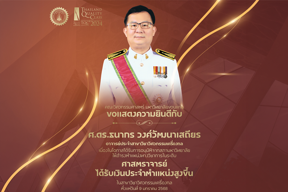 The Department of Mechanical Engineering, Faculty of Engineering, Khon Kaen University, extends our warmest congratulations to Professor Dr. Thanakorn Wongwattanasettheat on being approved by the University Council for the academic rank of "Professor (Higher Salary Grade)" in Mechanical Engineering, effective from January 9, 2025.