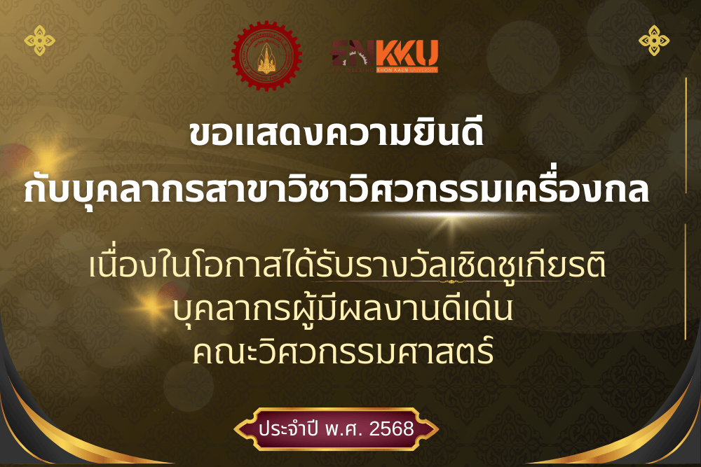The Department of Mechanical Engineering, Faculty of Engineering, Khon Kaen University, proudly congratulates and honors our distinguished faculty and staff members on receiving the "Distinguished Personnel Awards 2025". These awards recognize individuals who have made significant contributions, demonstrated exceptional dedication, and played a vital role in driving the missions of the Faculty and the University toward international excellence.